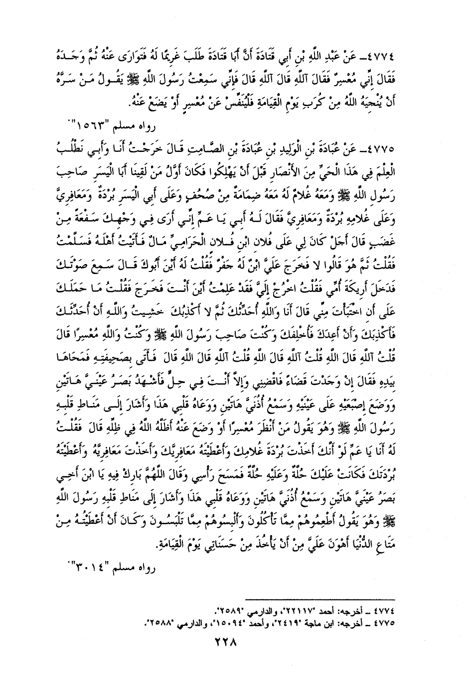 4775 - عُبَادَةُ بْنُ الْوَلِيدِ بْنِ عُبَادَةَ بْنِ الصَّامِتِ: خَرَجْتُ أَنَا وَأَبِي لطْلُبُ الْعِلْمَ فِي هَذَا الْحَيِّ مِنَ الأَنْصَارِ، فَكَانَ أَوَّلُ مَنْ لَقِينَا أَبَا الْيَسَرِ صَاحِبَ النبي - صلى الله عليه وسلم - وَمَعَهُ غُلامٌ على كل منهما بُرْدَةٌ، وَمَعَافِرِيَّ فَقَالَ لَهُ أَبِي: يَا عَمي إِنِّي أَرَى فِي وَجْهِكَ سَفْعَةً مِنْ غَضَبٍ، فقَالَ: أَجَلْ كَانَ لِي عَلَى فُلانٍ مَالٌ، فَأَتَيْتُ أَهْلَهُ، فَقُلْتُ: أثَمَّ هُوَ، فقَالُوا: لا، فَخَرَجَ ابْنٌ لَهُ جَفْرٌ، فَقُلْتُ لَهُ: أَيْنَ أَبُوكَ؟ قال: سَمِعَ صَوْتَكَ، فَدَخَلَ أَرِيكَةَ أُمِّي، فَقُلْتُ له: اخْرُجْ فَقَدْ عَلِمْتُ موضعك ,فَخَرَجَ ,فَقُلْتُ له: مَا حَمَلَكَ عَلَى أَنِ اخْتَبَأْتَ مِنِّي؟ قَالَ: وَالله أُحَدِّثُكَ ولا أَكْذِبُكَ خَشِيتُ أَنْ أُحَدِّثَكَ ,فَأَكْذِبَكَ ,وأَوعِدَكَ ,فَأُخْلِفَكَ ,وَكُنْتَ ,وقد صحبت النبي - صلى الله عليه وسلم - وَكُنْتُ ,وَالله مُعْسِرًا ,فقُلْتُ: الله إنك معسر ,قَالَ: الله ,فأعطيته صحيفته، فَمَحَاهَا بِيَدِهِ وقَلت: إِنْ وَجَدْتَ قَضَاءً فَاقْضِنِي وَإِلاَّ أَنْتَ فِي حِلٍّ ثم قال: وأَشْهَدُ بَصَرُ عَيْنَيَّ هَاتَيْنِ وَوَضَعَ إِصْبَعَيْهِ عَلَى عَيْنَيْهِ وَسَمْعُ أُذُنَيَّ هَاتَيْنِ وَوَعَاهُ قَلْبِي هَذَا وَأَشَارَ إِلَى نيَاطِ قَلْبِهِ رَسُولَ الله - صلى الله عليه وسلم - وَهُوَ يَقُولُ: مَنْ أَنْظَرَ مُعْسِرًا أَوْ وَضَعَ عَنْهُ أَظَلَّهُ الله فِي ظِلِّهِ فقال عبادة: فَقُلْتُ: أي عَمِّ لَوْ أَنَّكَ أَخَذْتَ بُرْدَةَ غُلامِكَ وَأَعْطَيْتَهُ مَعَافِرِيَّكَ كَانَتْ عَلَيْكَ حُلَّةٌ وَعَلَيْهِ حُلَّةٌ فَمَسَحَ رَأْسِي وَقَالَ: اللهمَّ بَارِكْ فِيهِ يَا ابْنَ أَخِي بَصَرُ عَيْنَيَّ هَاتَيْنِ وَسَمْعُ أُذُنَيَّ هَاتَيْنِ وَوَعَاهُ قَلْبِي هَذَا رَسُولَ الله - صلى
