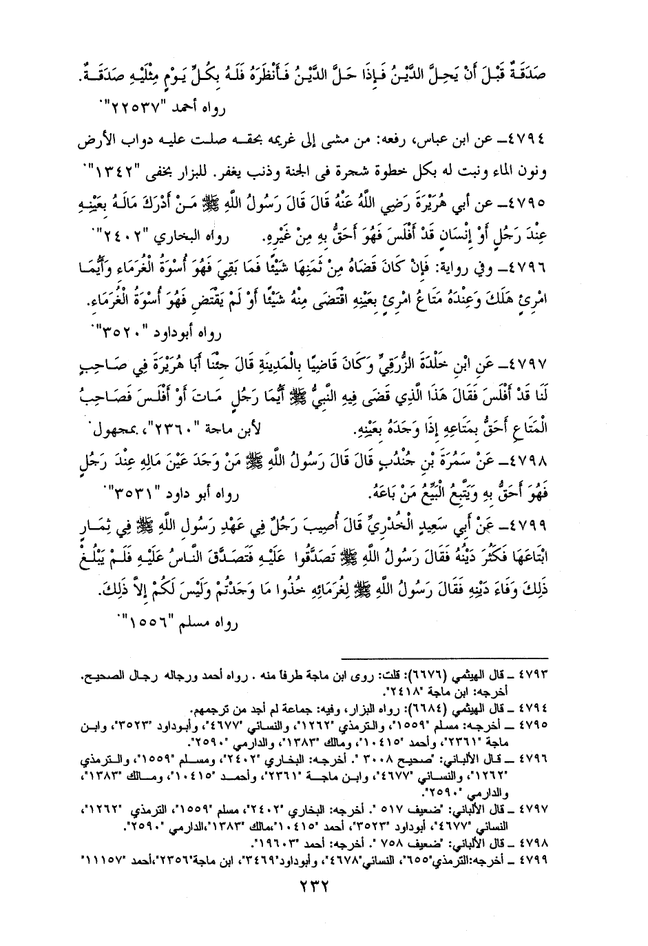 4795 - أبو هُرَيْرَةَ رفعه: مَنْ أَدْرَكَ مَالَهُ بِعَيْنِهِ عِنْدَ رَجُلٍ أَفْلَسَ فَهُوَ أَحَقُّ بِهِ مِنْ غَيْرِهِ (¬1).