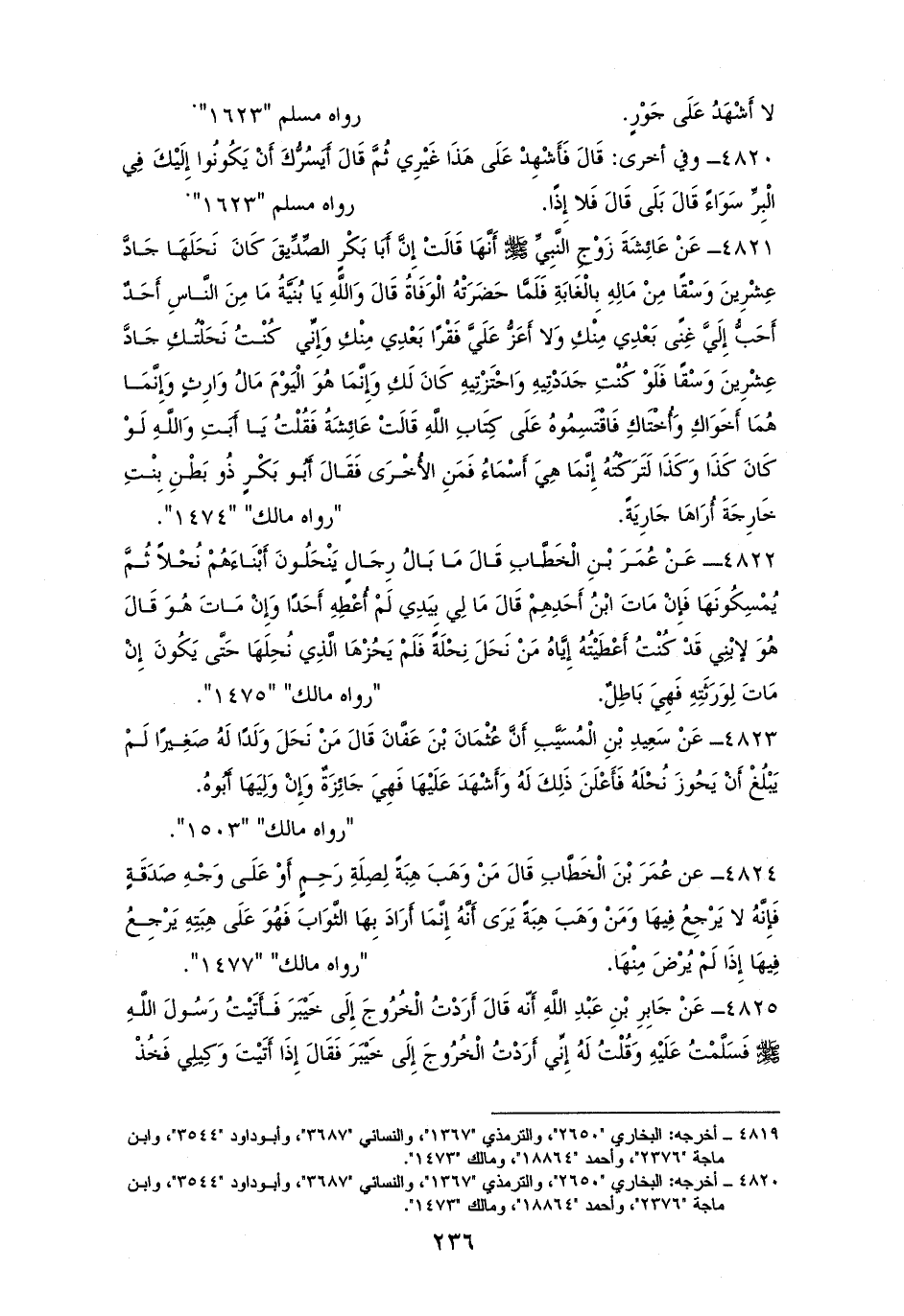 4820 - ومنها: أَشْهِدْ عَلَى هَذَا غَيْرِي؟ ثُمَّ قَالَ: أَيَسُرُّكَ أَنْ يَكُونُوا إِلَيْكَ فِي الْبِرِّ سَوَاءً؟ قَالَ: بَلَى. قَالَ: فَلا إِذًا. للستة (¬1).