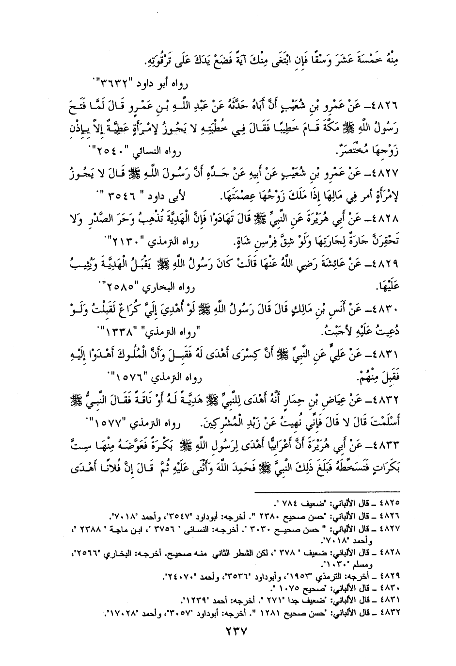 4831 - عَلِيٌّ: أَنَّ كِسْرَى أَهْدَى للنبي - صلى الله عليه وسلم - هديةً فَقَبِلَ منه، وَأَنَّ الْمُلُوكَ أَهْدَوْا إِلَيْهِ فَقَبِلَ مِنْهُمْ. هما للترمذي (¬1).