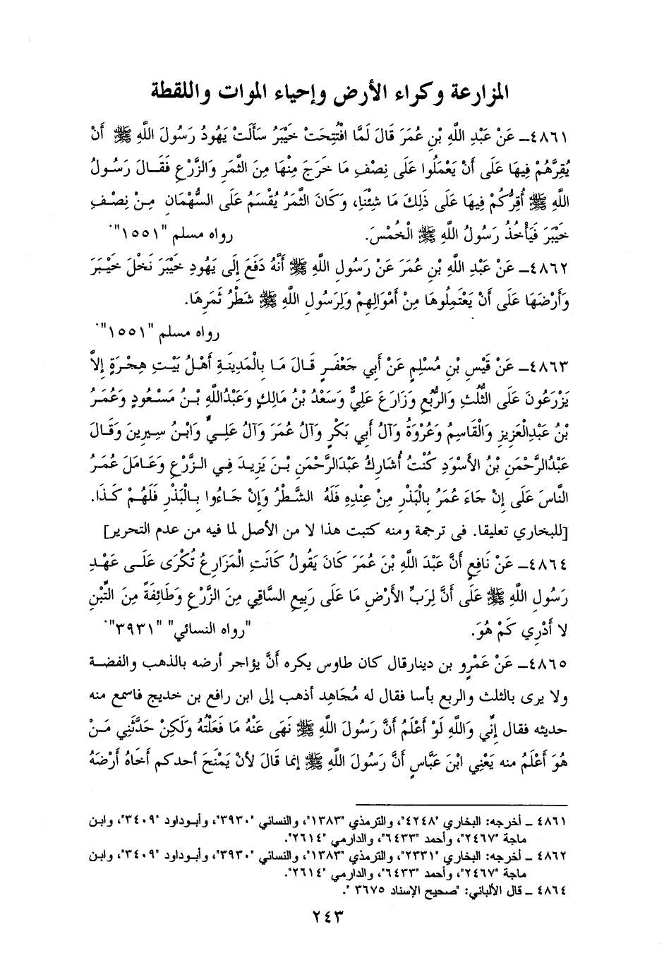 4863 - قَيْسُ بْنُ مُسْلِمٍ عَنْ أَبِي جَعْفَرٍ: قَالَ: مَا بِالْمَدِينَةِ أَهْلُ بَيْتِ هِجْرَةٍ إِلاَّ يَزْرَعُونَ عَلَى الثُّلُثِ وَالرُّبُعِ وَزَارَعَ عَلِيٌّ وَسَعْدُ بْنُ مَالِكٍ وابْنُ مَسْعُودٍ وَعُمَرُ بْنُ عَبْدِالْعَزِيزِ وَالْقَاسِمُ وَعُرْوَةُ وَآلُ أَبِي بَكْرٍ وَآلُ عُمَرَ وَآلُ عَلِيٍّ وَابْنُ سِيرِينَ، وَقَالَ عَبْدُالرَّحْمَنِ بْنُ الأَسْوَدِ: كُنْتُ أُشَارِكُ عَبْدَالرَّحْمَنِ بْنَ يَزِيدَ فِي الزَّرْعِ وَعَامَلَ عُمَرُ النَّاسَ عَلَى إِنْ جَاءَ عُمَرُ بِالْبَذْرِ مِنْ عِنْدِهِ فَلَهُ الشَّطْرُ وَإِنْ جَاءُوا بِالْبَذْرِ فَلَهُمْ كَذَا. للبخاري. في ترجمة ,ومنه كتبت هذا لا من الأصل لما فيه (¬1).