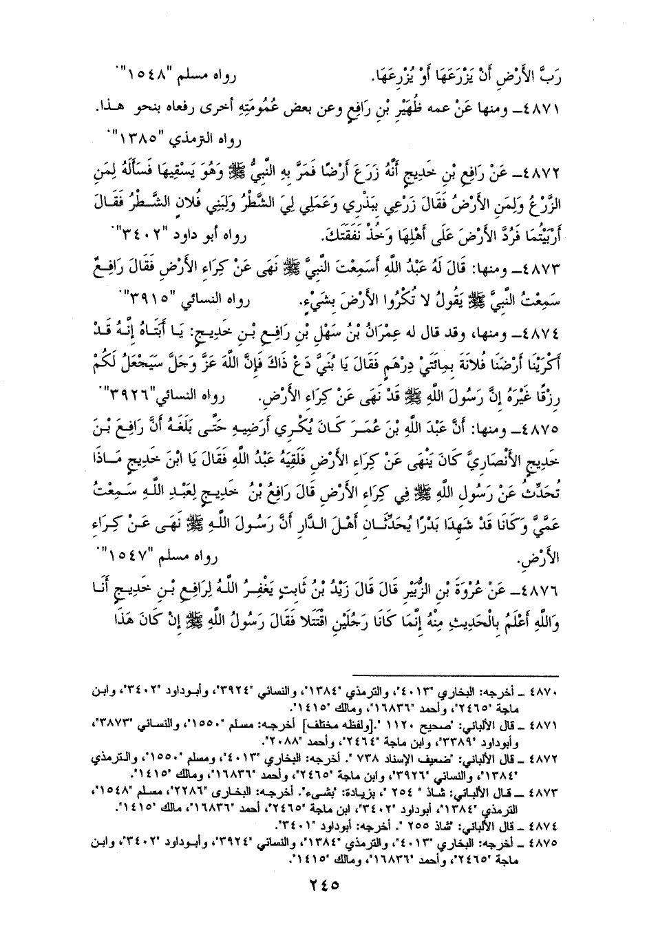 4872 - ومنها: رَافِعُ: أَنَّهُ زَرَعَ أَرْضًا فَمَرَّ بِهِ النَّبِيُّ - صلى الله عليه وسلم - وَهُوَ يَسْقِيهَا فَسَأَلَهُ: لِمَنِ الزَّرْعُ؟ وَلِمَنِ الأَرْضُ؟ , فَقَالَ: زَرْعِي بِبَذْرِي وَعَمَلِي ,لِيَ الشَّطْرُ وَلِبَنِي فُلانٍ الشَّطْرُ ,فَقَالَ: أَرْبَيْتُمَا ,فَرُدَّ الأَرْضَ عَلَى أَهْلِهَا وَخُذْ نَفَقَتَكَ (¬1).