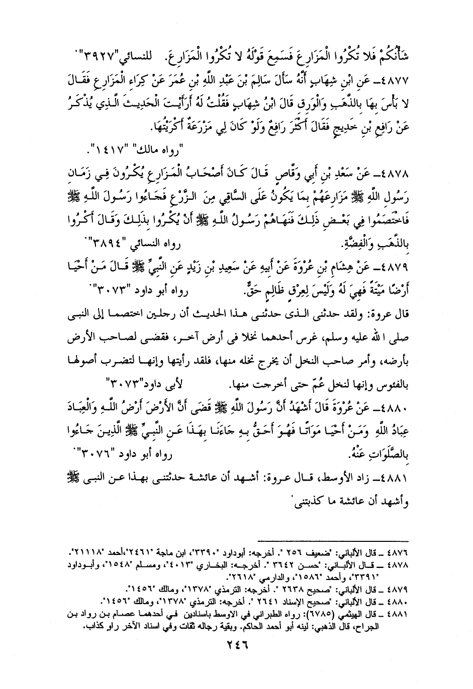 4879 - مَنْ أَحْيَا أَرْضًا مَيْتَةً فَهِيَ لَهُ وَلَيْسَ لِعِرْقٍ ظَالِمٍ حَقٌّ. لمالك ,والترمذي ,وأبي داود. وزاد قال عروة: ولقد حدثني الذى حدثني هذا الحديث أن رجلين اختصما إلى النبي - صلى الله عليه وسلم -، غرس أحدهما نخلا في أرض الآخر، فقضى لصاحب الأرض بأرضه، وأمر صاحب النخل أن يخرج نخله منها، فلقد رأيتها وإنها لتضرب أصولها بالفئوس وإنها لنخل عُمّ حتى أخرجت منها. لأبى داود (¬1).