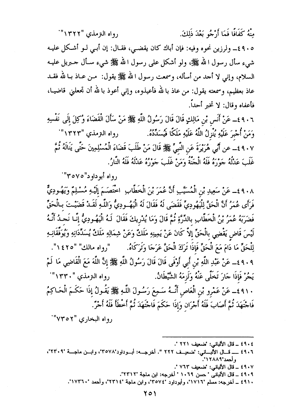 4907 - مَنْ طَلَبَ قَضَاءَ الْمُسْلِمِينَ حَتَّى يَنَالَهُ ثُمَّ غَلَبَ عَدْلُهُ جَوْرَهُ فَلَهُ الْجَنَّةُ وَمَنْ غَلَبَ جَوْرُهُ عَدْلَهُ فَلَهُ النَّارُ. لأبي داود (¬1).