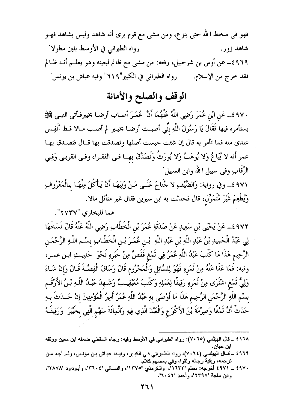 4972 - يَحْيَى بْنُ سَعِيدٍ: نسخ لِي عَبْدُ الْحَمِيدِ بْنُ عَبْدِ الله بْنِ عُمَرَ صَدَقَةَ عُمَرَ: بِسْم الله الرَّحْمَنِ الرَّحِيمِ، هَذَا مَا كَتَبَ عَبْدُ الله عُمَرُ فِي ثَمْغٍ بنحو حَدِيثِ ابن عمر، وفيه: فَمَا عَفَا عَنْهُ مِنْ ثَمَرِةٍ فَهُوَ لِلسَّائِلِ وَالْمَحْرُومِ، وَإِنْ شَاءَ وَلِيُّ ثَمْغٍ اشْتَرَى مِنْ ثَمَرِهِ رَقِيقًا لِعَمَلِهِ وَكَتَبَ مُعَيْقِيبٌ، وَشَهِدَ عَبْدُ الله بْنُ الأَرْقَمِ هَذَا مَا أَوْصَى بِهِ عَبْدُ الله عُمَرُ أَمِيرُ الْمُؤْمِنِينَ أنه إِنْ حَدَثَ بِهِ حَدَثٌ أَنَّ ثَمْغًا، وَصِرْمَةَ بْنَ الأَكْوَعِ، وَالْعَبْدَ الَّذِي فِيهِ، وَالْمِائَةَ السَهْمٍ الَّتِي بِخَيْبَرَ، وَرَقِيقَهُ