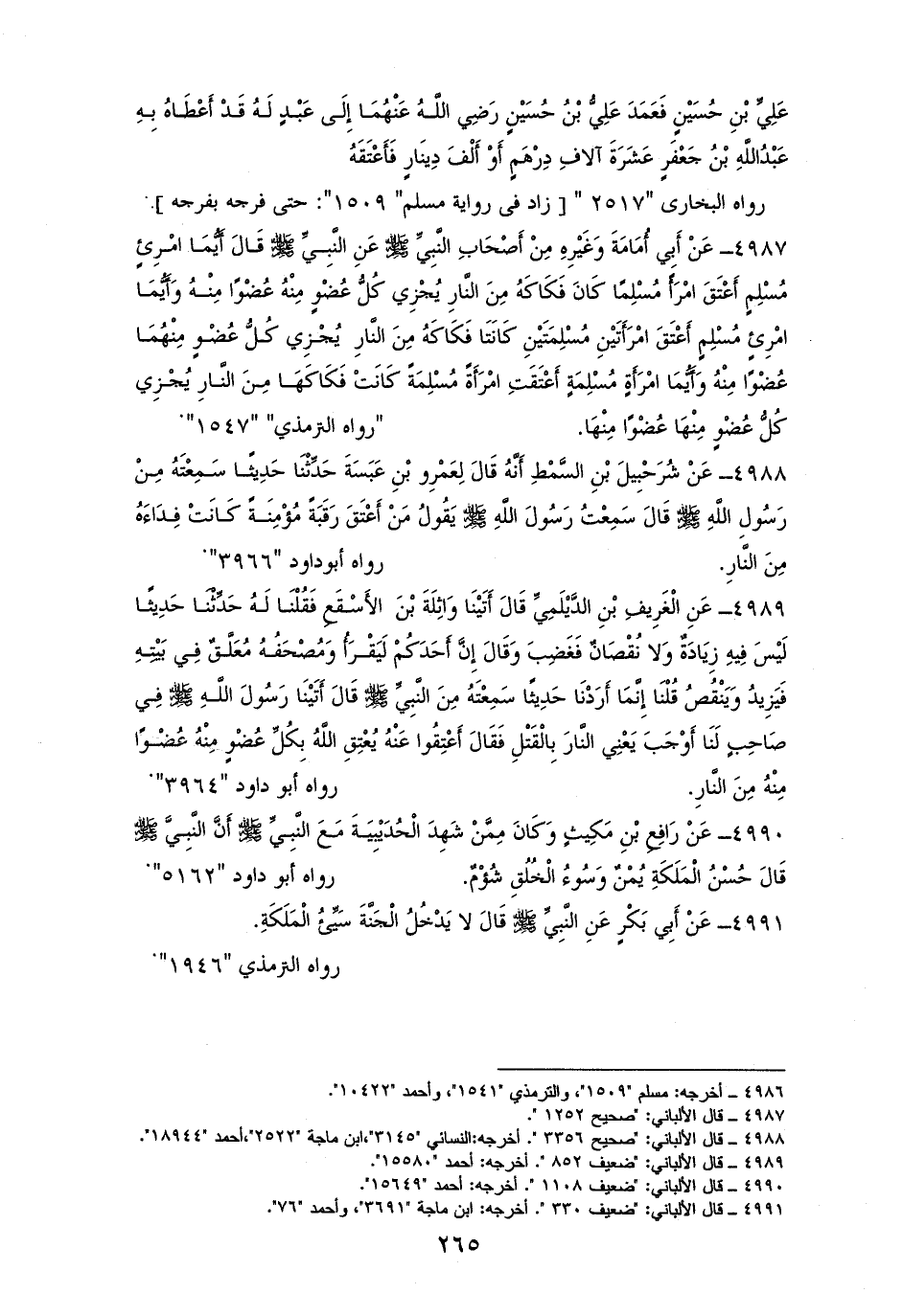 4988 - أبو نجيح رفعه: ((مَنْ أَعْتَقَ رَقَبَةً مُؤْمِنَةً كَانَتْ له فِدَاءَهُ مِنَ النَّارِ)) (¬1).