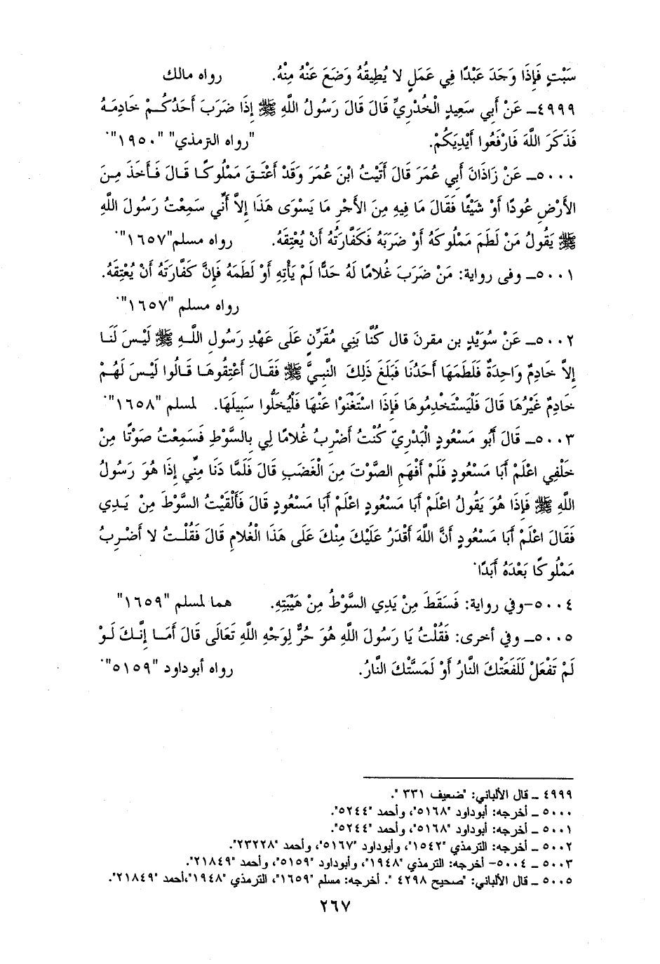 5002 - سُوَيْدُ بنُ مقرنَ: كُنَّا بَنِي مُقَرِّنٍ لَيْسَ لَنَا إِلاَّ خَادِمٌ وَاحِدَةٌ فَلَطَمَهَا أَحَدُنَا، فَبَلَغَ ذَلِكَ النَّبِيَّ - صلى الله عليه وسلم - فَقَالَ: ((أَعْتِقُوهَا)) قَالُوا: لَيْسَ لَهُمْ خَادِمٌ غَيْرُهَا. قَالَ: ((فَلْيَسْتَخْدِمُوهَا فَإِذَا اسْتَغْنَوْا عَنْهَا فَلْيُخَلُّوا سَبِيلَهَا)). لمسلم (¬1).