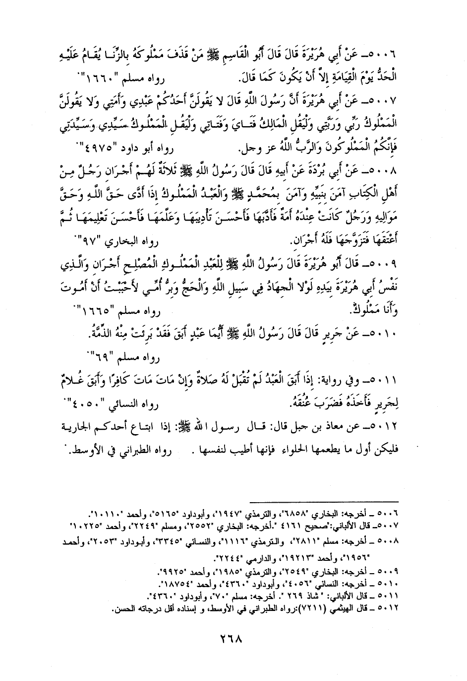 5006 - أبو هُرَيْرَةَ رفعه: ((مَنْ قَذَفَ مَمْلُوكَهُ وهو بريء مما قال، أقام عليه الْحَدُّ يَوْمَ الْقِيَامَةِ)). للشيخين وأبي داود والترمذي (¬1).