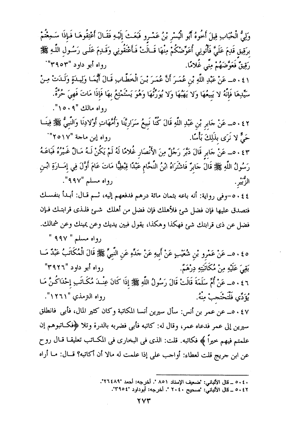 5046 - أُمُّ سَلَمَةَ رفعته: ((إِذَا كَانَ عِنْدَ مُكَاتَبِ إِحْدَاكُنَّ مَا يُؤَدِّي فَلْتَحْتَجِبْ مِنْهُ)). هما لأبي داود والترمذي (¬1).