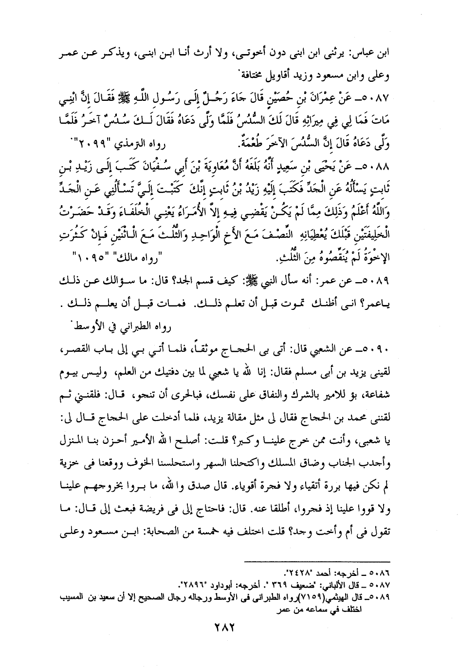 5087 - عِمْرَانُ بْنُ حُصَيْنٍ: أن رَجُلاً جَاءَ إِلَى النبي - صلى الله عليه وسلم - فَقَالَ: إِنَّ ابن ابْنِي مَاتَ، فَمَا لِي من مِيرَاثِهِ قَالَ: ((السُّدُسُ)) فَلَمَّا وَلَّى دَعَاهُ فَقَالَ: ((لَكَ سُدُسٌ آخَرُ)) فَلَمَّا وَلَّى دَعَاهُ وقال: ((إِنَّ السُّدُسَ الآخَرَ طُعْمَةٌ)). لأبي داود ,والترمذي (¬1).