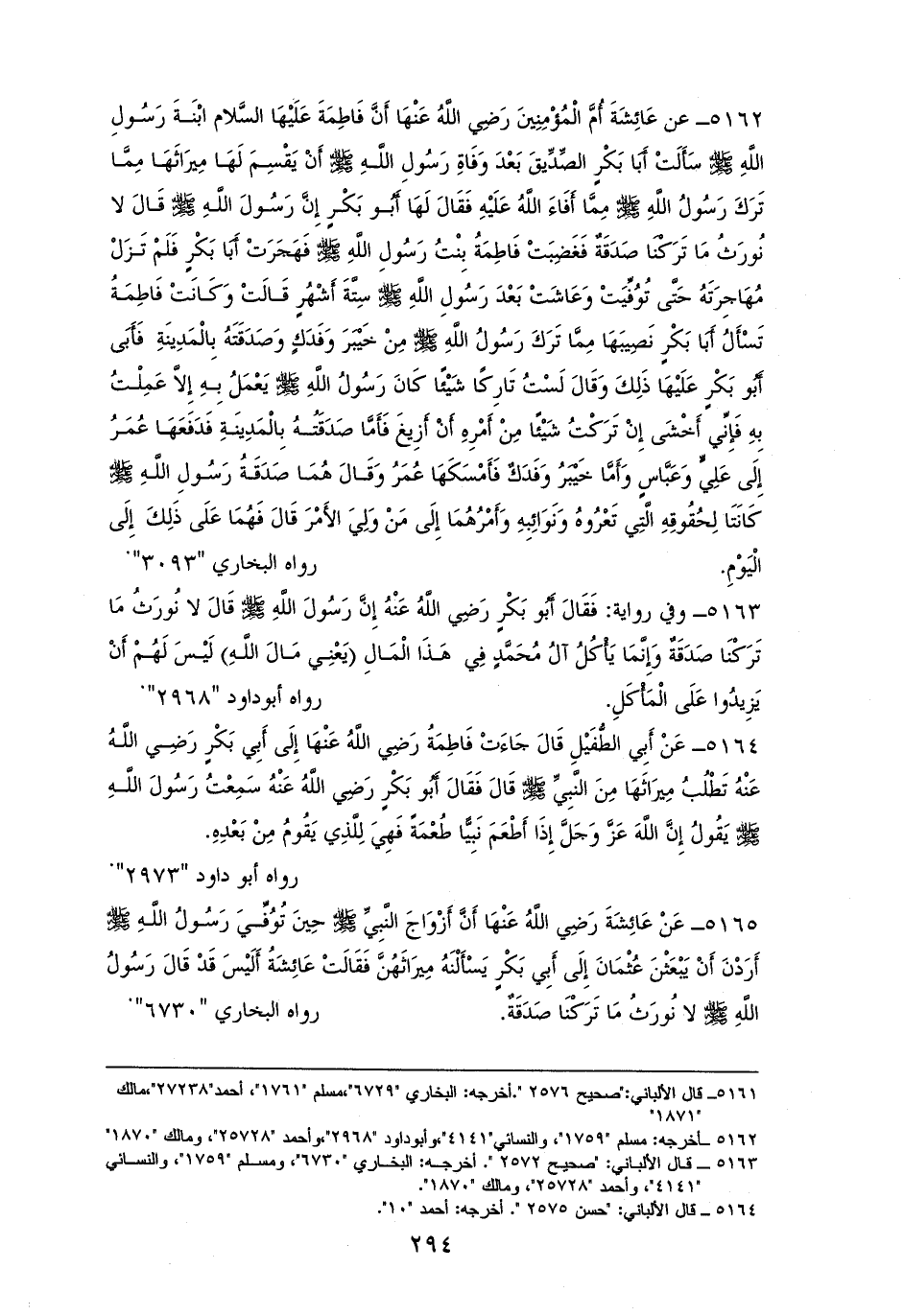 5162 - عَائِشَةُ: أَنَّ فَاطِمَةَ سَأَلَتْ أَبَا بَكْرٍ أَنْ يَقْسِمَ لَهَا مِيرَاثَهَا مِمَّا تَرَكَ - صلى الله عليه وسلم - مِمَّا أَفَاءَ الله عَلَيْهِ، فَقَالَ لَهَا أَبُو بَكْرٍ: إِنَّ رَسُولَ الله - صلى الله عليه وسلم - قَالَ: ((لا نُورَثُ، مَا تَرَكْنَا صَدَقَةٌ))، فَغَضِبَتْ، فهجرته فَلَمْ تَزَلْ بذلك حَتَّى تُوُفِّيَتْ، وَعَاشَتْ بَعْده - صلى الله عليه وسلم - سِتَّةَ أَشْهُرٍ إلا ليالي وَكَانَتْ تَسْأَلُه أن يقسم لها نَصِيبَهَا مِمَّا أفاء الله على رسوله مِنْ خَيْبَرَ وَفَدَكٍ ومن صَدَقَتِهُ بِالْمَدِينَةِ. فقال لها أبو بكر: لستُ بالذي أقسم من ذلك شيئًا، ولَسْتُ تَارِكًا شَيْئًا كَانَ - صلى الله عليه وسلم - يَعْمَلُ بِهِ فيها إِلاَّ عَمِلْتُه، فَإِنِّي أَخْشَى إِنْ تَرَكْتُ شَيْئًا مِنْ أَمْرِهِ أَنْ أَزِيغَ، ثم فعل ذلك عمر، فَأَمَّا صَدَقَتُهُ بِالْمَدِينَةِ فَدَفَعَهَا عُمَرُ إِلَيَّ وعَلِيٍّ وَعَبَّاسٍ وأَمسَكَ خَيبَرَ وَفَدكَ، وَقَالَ: هُمَا صَدَقَةُ رَسُولِ الله - صلى الله عليه وسلم - كَانَت لِحُقُوقِهِ الَّتِي تَعْرُوهُ وَنَوَائِبِهِ، وَأَمْرُهُمَا إِلَى مَنْ وَلِيَ الأَمْرَ فَهُمَا عَلَى ذَلِكَ إِلَى الْيَوْمِ (¬1).