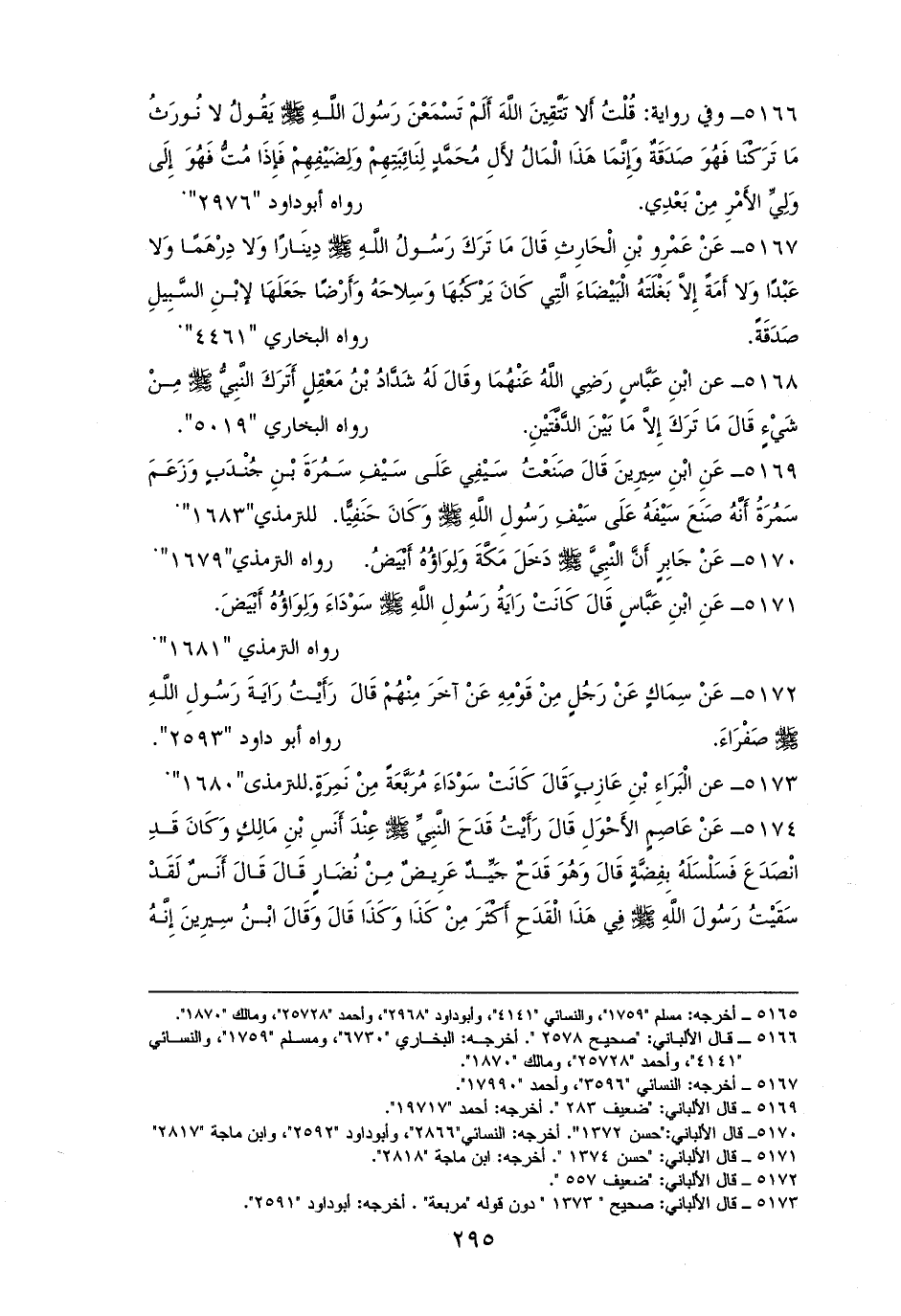 5167 - عَمْرِوُ بْنُ الْحَارِثِ الخزاعي: مَا تَرَكَ النبي - صلى الله عليه وسلم - دِينَارًا وَلا دِرْهَمًا وَلا عَبْدًا وَلا أَمَةً ولا شيئًا، إِلاَّ بَغْلَتَهُ الْبَيْضَاءَ الَّتِي كَانَ يَرْكَبُهَا وَسِلاحَهُ، وَأَرْضًا جَعَلَهَا لابْنِ السَّبِيلِ صَدَقَةً. للبخاري، والنسائي (¬1).