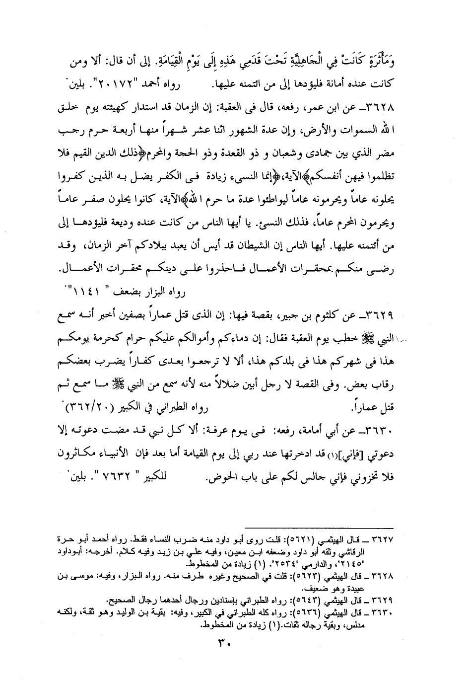 3628 - ابنُ عمر رفعه: قال في العقبة: ((إنَّ الزمانَ قد استدارَ كَهَيْئَتِهِ يَومَ خَلَقَ الله السموات والأرض، وإن عدة الشهور اثنا عشر شهرًا منها أربعةٌ حُرُمٌ: رَجَبُ مُضَر وذو القعدة وذو الحجة والمحرم {ذلك الدين القيم فلا تظلموا فيهن أنفسكم}، {إنما النسيء زيادة في الكفر يضل به الذين كفروا يحلونه عامًا ويحرمونه عامًا ليواطئوا عدة ما حرم الله}، كانوا يحلون صفر عاماً ويحرمون المحرم عاماً، ويحرمون صفر عامًا ويحلون المحرم عامًا فذلك النسيء. أيها الناس: إن الشيطان قد أيس أن يعبد، وقد رضي منكم بمحقّرات الأعمال فاحذروا على دينكم محقرات الأعمال. للبزار بضعف (¬1).