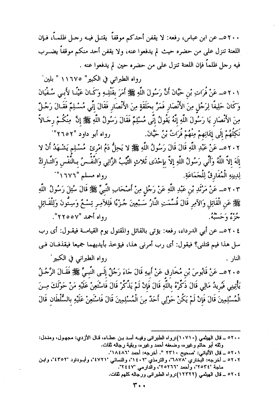 5202 - ابنُ مسعود رفعه: ((لا يَحِلُّ دَمُ امْرِئٍ مُسْلِمٍ يَشْهَدُ أَنْ لا إِلَهَ إِلاَّ الله وَأَنِّي رَسُولُ الله إِلاَّ بِإِحْدَى ثَلاثٍ الثَّيِّبُ الزَّانِي وَالنَّفْسُ بِالنَّفْسِ وَالتَّارِكُ لِدِينِهِ الْمُفَارِقُ لِلْجَمَاعَةِ)). للستة إلا مالكًا (¬1).