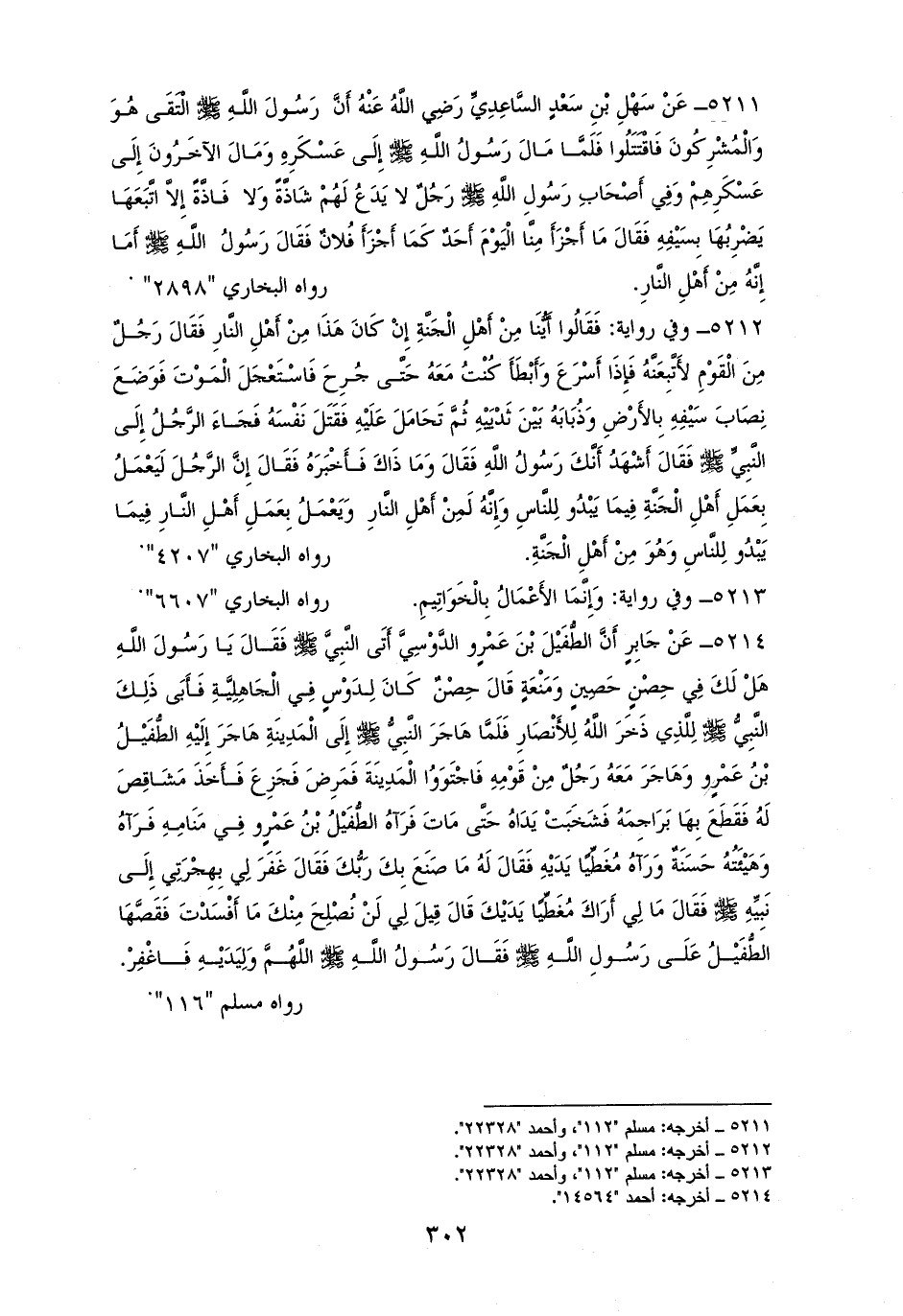 5212 - وفي رواية قالوا: أينا من أهل الجنة إن كان هذا من أهل النار فقال رجل من القوم: أنا صاحبه أبدًا، فخرج معه كلما وقَفَ وقَفَ معه، وإذا أسرع أَسرع معه، قال فجرح الرجل جرحًا شديد، فاستعجل الموت، فوضع سيفه بالأرض وذبابه بين ثدييه ثم تحامل على سيفه فقتل نفسه، فخرج الرجل إلى النبي - صلى الله عليه وسلم - فقال: أشهد أنك رسول الله فقال: ((وما ذاك)) قال: الرجل الذي ذكرت آنفًا أنه من أهل النار فأعظم الناس ذلك، فقلت أنا لكم به، فخرجت في طلبه حتى جرح جرحًا شديدًا فاستعجل الموت فوضع نصل سيفه بالأرض وذبابه بين ثدييه ثم تحامل عليه فقتل نفسه فقال النبي - صلى الله عليه وسلم - عند ذلك: ((إن الرجل ليعمل عمل أهل الجنة فيما يبدوا للناس وهو من أهل النار)) (¬1).