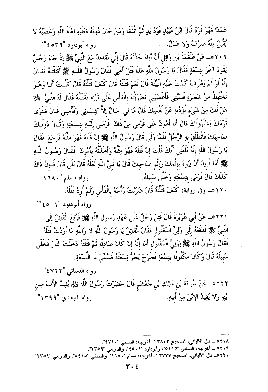 5219 - وَائِلُ بنُ حجر: إِنِّي لَقَاعِدٌ مَعَ النَّبِيِّ - صلى الله عليه وسلم - إِذْ جَاءَ رَجُلٌ يَقُودُ آخَرَ بِنِسْعَةٍ فَقَالَ يَا رَسُولَ الله هَذَا قَتَلَ أَخِي فَقَالَ له - صلى الله عليه وسلم -: ((أَقَتَلْتَهُ)). فَقَالَ: إِنَّهُ لَوْ لَمْ يَعْتَرِفْ أَقَمْتُ عَلَيْهِ الْبَيِّنَةَ. قَالَ: نَعَمْ قَتَلْتَهُ. قَالَ: ((كَيْفَ قَتَلْتَهُ)). قَالَ: كُنْتُ أَنَا وَهُوَ نَخْتَبِطُ مِنْ شَجَرَةٍ فَسَبَّنِي وأَغْضَبَنِي فَضَرَبْتُهُ بِالْفَأْسِ عَلَى قَرْنِهِ فَقَتَلْتُهُ فَقَالَ لَهُ - صلى الله عليه وسلم -: ((هَلْ لَكَ مِنْ شَيْءٍ تُؤَدِّيهِ عَنْ نَفْسِكَ)) قَالَ: مَا لِي إِلاَّ كِسَائِي وَفَأْسِي. قَالَ: ((أَتَرَى قَوْمَكَ يَشْتَرُونَكَ)). قَالَ: أَنَا أَهْوَنُ عَلَى قَوْمِي مِنْ ذَلكَ فَرَمَى إِلَيْهِ النبي - صلى الله عليه وسلم - بِنِسْعَتِهِ فقَالَ: ((دُونَكَ صَاحِبَكَ)) فَانْطَلَقَ بِهِ الرَّجُلُ فَلَمَّا وَلَّى قَالَ - صلى الله عليه وسلم -: ((إِنْ قَتَلَهُ فَهُوَ مِثْلُهُ)) فَرَجَعَ إليه فَقَالَ: بَلَغَنِي أَنَّكَ قُلْتَ إِنْ قَتَلَهُ فَهُوَ مِثْلُهُ وما أَخَذْتُهُ إلا بِأَمْرِكَ فَقَالَ - صلى الله عليه وسلم -: ((أَمَا تُرِيدُ أَنْ يَبُوءَ بِإِثْمه وَإِثْمِ صَاحِبِكَ)) قَالَ: بلى يَا نَبِيَّ الله قَالَ: ((فَإِنَّ ذلك كَذَلك)) قَالَ: فَرَمَى بِنِسْعَتِهِ وَخَلَّى سَبِيلَهُ (¬1).