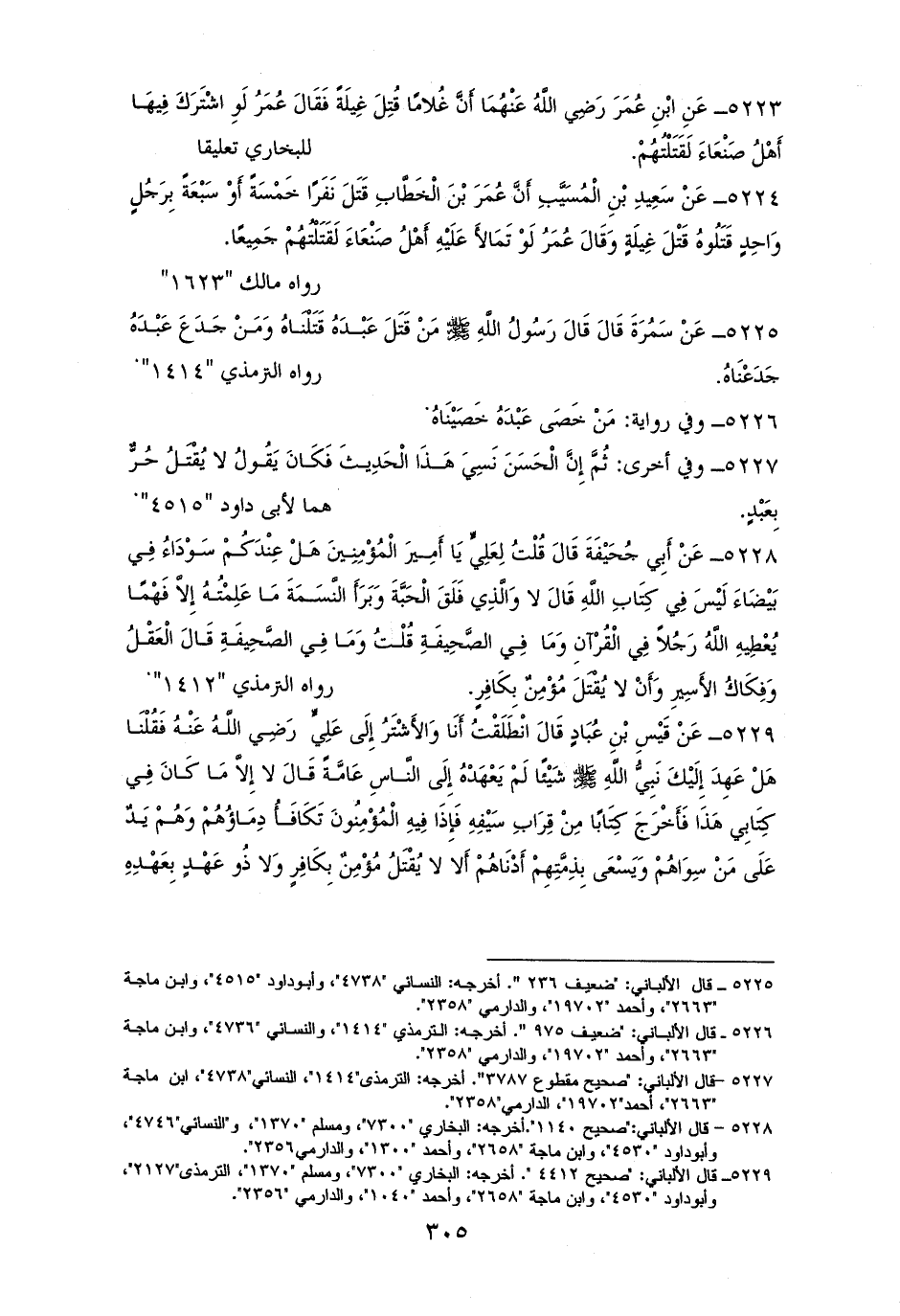 5223 - ابْنُ عُمَرَ: أَنَّ غُلامًا قُتِلَ غِيلَةً فَقَالَ عُمَرُ لَوِ اشْتَرَكَ فِيهَ أَهْلُ صَنْعَاءَ لَقَتَلْتُهُمْ. للبخاري (¬1).