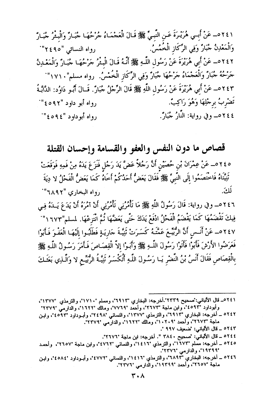 5242 - في رواية: ((الْبِئْرُ جَرْحُهَا جُبَارٌ وَالْمَعْدِنُ جَرْحُهُ جُبَارٌ وَالْعَجْمَاءُ جَرْحُهَا جُبَارٌ وَفِي الرِّكَازِ الْخُمْسُ)). للستة (¬1).
