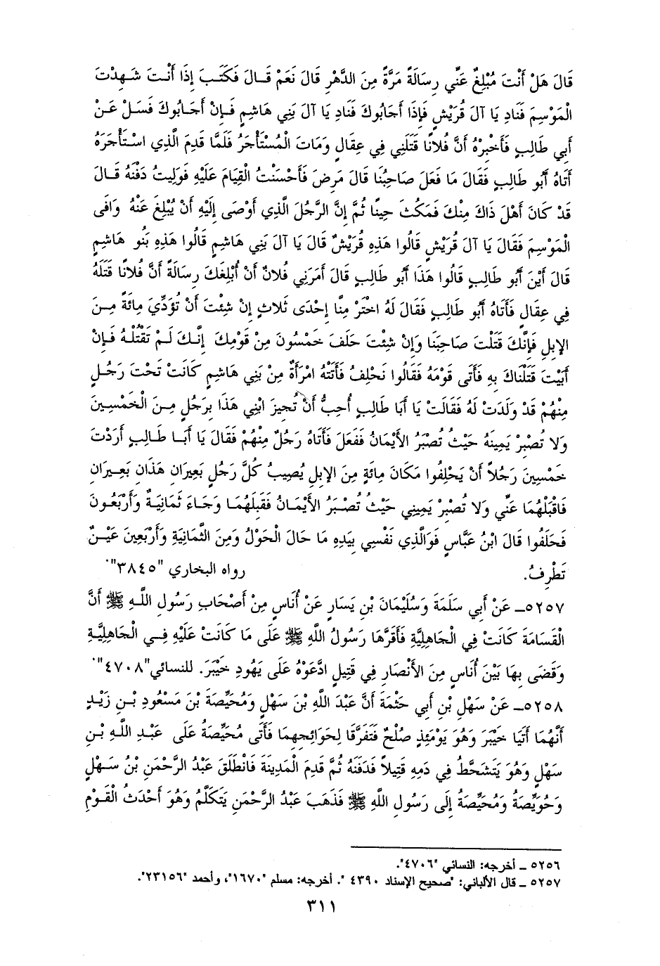 5257 - أُنَاسٌ مِنْ الصحابة: أَنَّ الْقَسَامَةَ كَانَتْ فِي الْجَاهِلِيَّةِ فَأَقَرَّهَا النبي - صلى الله عليه وسلم - عَلَى مَا كَانَتْ عَلَيْهِ فِي الْجَاهِلِيَّةِ، وَقَضَى بِهَا بَيْنَ نَاسٍ مِنَ الأَنْصَارِ فِي قَتِيلٍ ادَّعَوْهُ عَلَى يَهُودِ خَيْبَرَ. لمسلم والنسائي (¬1).