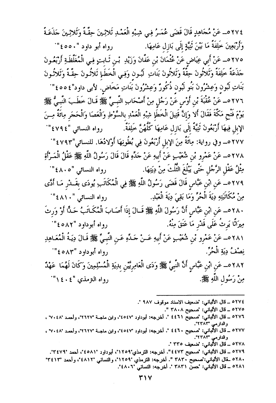 5281 - عَمْرُو بْنُ شُعَيْبٍ، عَنْ أَبِيهِ، عَنْ جَدِّهِ رفعه: ((دِيَةُ الْمُعَاهِدِ نِصْفُ دِيَةِ الْحُرِّ)). لأبي داود (¬1).