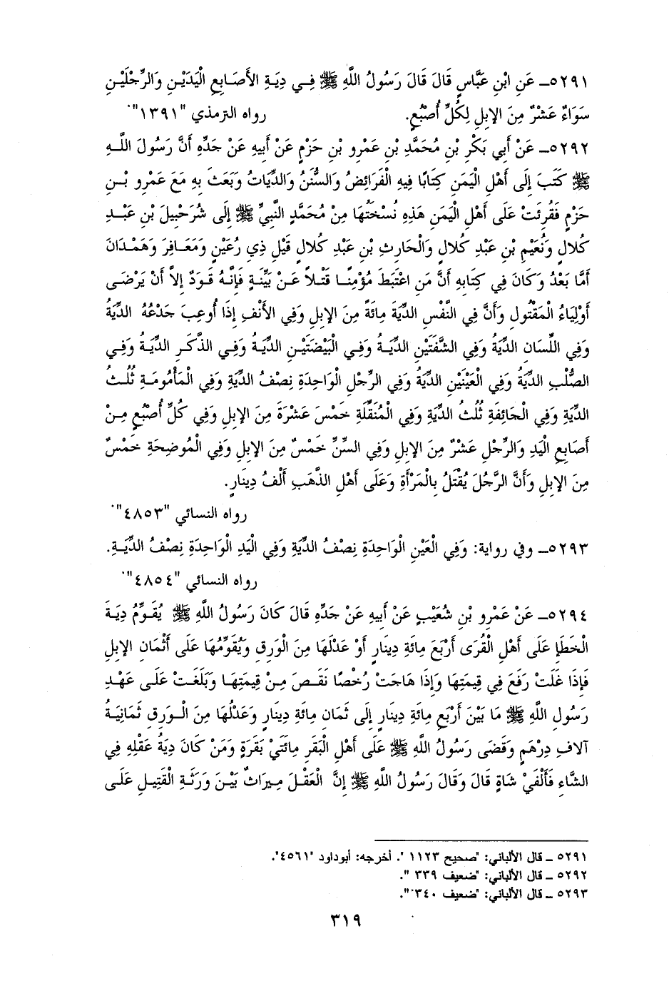 5292 - عبدُ الله بنُ أبي بَكْرِ بْنُ مُحَمَّدِ بْنُ عَمْرِو بْنُ حَزْمٍ، عَنْ أَبِيهِ: أن النبي - صلى الله عليه وسلم - كَتَبَ إِلَى أَهْلِ الْيَمَنِ كِتَابًا فِيهِ الْفَرَائِضُ وَالسُّنَنُ وَالدِّيَاتُ وَبَعَثَ بِهِ عَمْرِو بْنِ حَزْمٍ فَقُرِئَتْ عَلَى أَهْلِ الْيَمَنِ هَذِهِ نُسْخَتُهَا: ((مِنْ مُحَمَّدٍ النَّبِيِّ إِلَى شُرَحْبِيلَ بْنِ عَبْدِ كُلالٍ وَنُعَيْمِ بْنِ عَبْدِ كُلالٍ، قَيْلِ ذِيِ رُعَيْنٍ وَمَعَافِرَ وَهَمْدَانَ أَمَّا بَعْدُ وَكَانَ فِي كِتَابِهِ أَنَّ مَنِ اعْتَبَطَ مُؤْمِنًا قَتْلاً فَإِنَّهُ قَوَدٌ، إِلاَّ أَنْ يَرْضَى أَوْلِيَاءُ الْمَقْتُولِ، وَأَنَّ فِي النَّفْسِ الدِّيَةَ مِائَةً مِنَ الإبِلِ، وَفِي الأَنْفِ إِذَا أُوعِبَ جَدْعُهُ الدِّيَةُ، وَفِي اللِّسَانِ الدِّيَةُ، وَفِي الشَّفَتَيْنِ الدِّيَةُ، وَفِي الْبَيْضَتَيْنِ الدِّيَةُ، وَفِي الذَّكَرِ الدِّيَةُ، وَفِي الصُّلْبِ الدِّيَةُ وَفِي الْعَيْنَيْنِ الدِّيَةُ، وَفِي الرِّجْلِ الْوَاحِدَةِ نِصْفُ الدِّيَةِ وَفِي الْمَأْمُومَةِ ثُلُثُ الدِّيَةِ، وَفِي الْجَائِفَةِ ثُلُثُ الدِّيَةِ، وَفِي الْمُنَقِّلَةِ (خَمْسَ عَشْرَةَ) (¬1) مِنَ الإبِلِ، وَفِي كُلِّ أُصْبُعٍ مِنْ أَصَابِعِ الْيَدِ أو الرِّجْلِ عَشْرٌ مِنَ الإبِلِ، وَفِي السِّنِّ خَمْسٌ مِنَ الإبِلِ، وَفِي الْمُوضِحَةِ خَمْسٌ مِنَ الإبِلِ، وَأَنَّ الرَّجُلَ يُقْتَلُ بِالْمَرْأَةِ وَعَلَى أَهْلِ الذَّهَبِ أَلْفُ دِينَارٍ)) (¬2).
