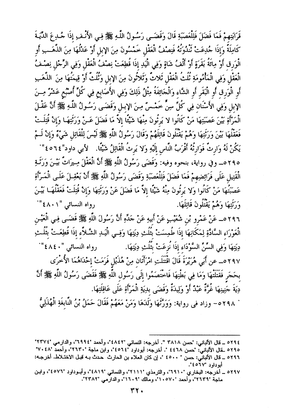 5295 - وللنسائي نحوه وفيه: قَضَى - صلى الله عليه وسلم - أَنَّ الْعَقْلَ مِيرَاثٌ بَيْنَ وَرَثَةِ الْقَتِيلِ عَلَى فَرَائِضِهِمْ فَمَا فَضَلَ فَلِلْعَصَبَةِ. وَقَضَى أَنْ يَعْقِلَ عَلَى الْمَرْأَةِ عَصَبَتُهَا مَنْ كَانُوا وَلا يَرِثُونَ مِنْهُ شَيْئًا، إِلاَّ مَا فَضَلَ عَنْ وَرَثَتِهَا، فَإِنْ قُتِلَتْ فَعَقْلُهَا على وَرَثَتِهَا وَهُمْ يَقْتُلُونَ قَاتِلَهَا. لأبي داود والنسائي (¬1).