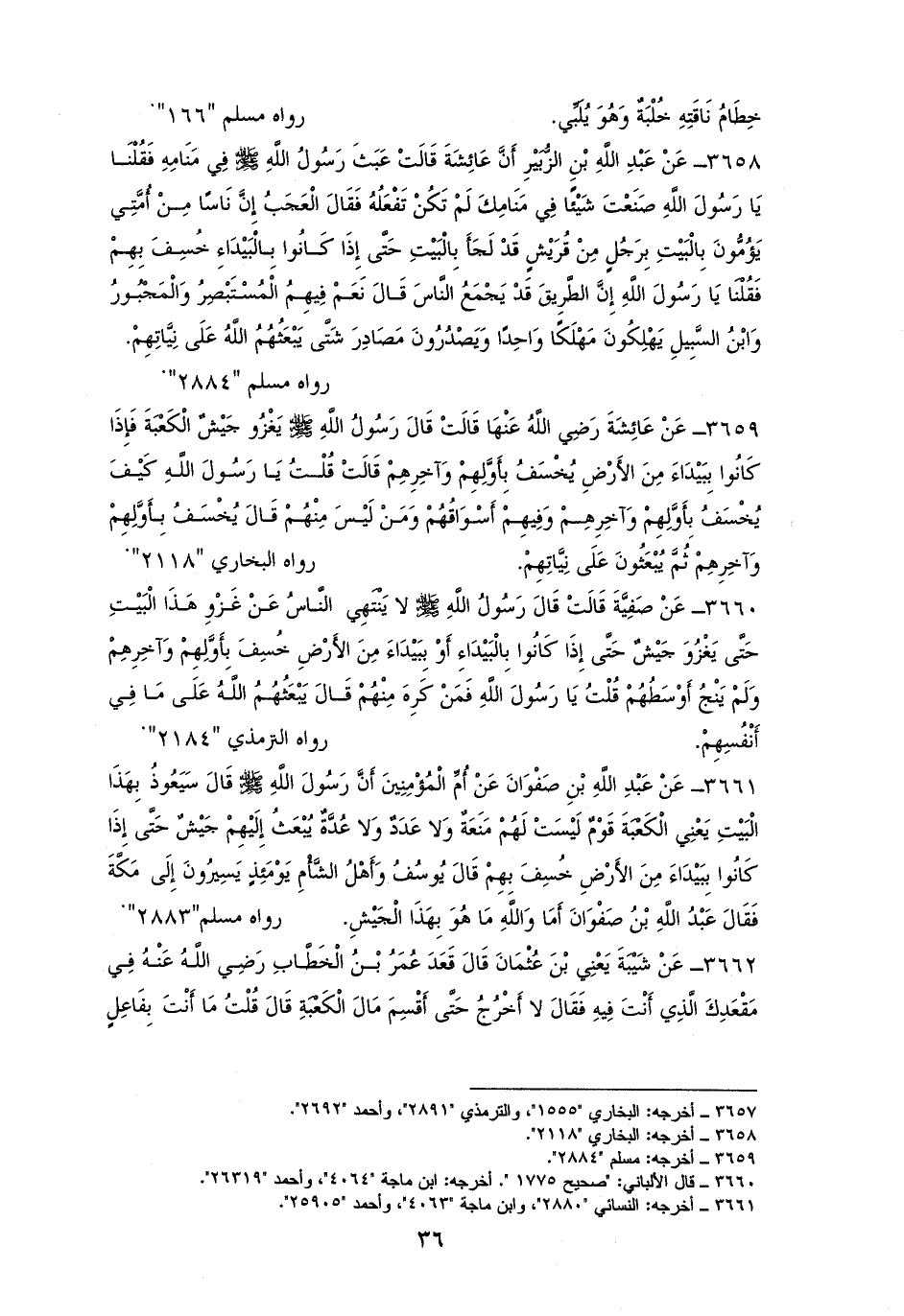 3660 - صَفِيَّةُ رفعته: ((لا يَنْتَهِي النَّاسُ عَنْ غَزْوِ هَذَا الْبَيْتِ حَتَّى يَغْزُوَ جَيْشٌ، حَتَّى إِذَا كَانُوا بِالْبَيْدَاءِ أَوْ بِبَيْدَاءَ مِنَ الأَرْضِ خُسِفَ بِأَوَّلِهِمْ وَآخِرِهِمْ وَلَمْ يَنْجُ منهم أَوْسَطُهُمْ))، قُلْتُ: يَا رَسُولَ الله، فَمَنْ كَرِهَ مِنْهُمْ، قَالَ: ((يَبْعَثُهُمُ الله عَلَى مَا فِي أَنْفُسِهِمْ)). للترمذي (¬1).