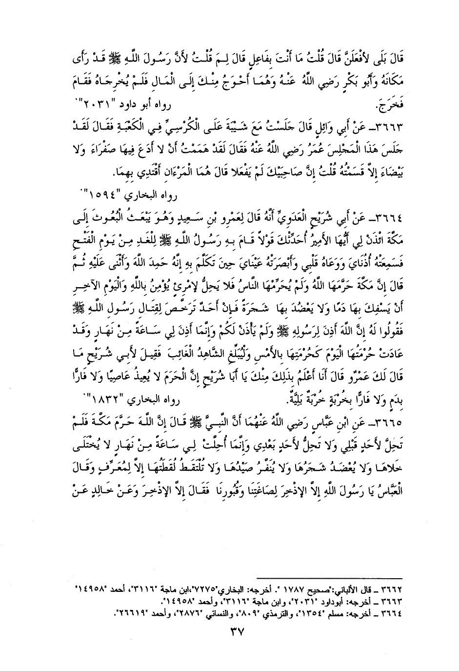 3664 - أبو شُرَيْحٍ الْعَدَوِي قَالَ لِعَمْرِو بْنِ سَعِيدٍ، وَهُوَ يَبْعَثُ الْبُعُوثَ إِلَى مَكَّةَ: ائْذَنْ لِي أَيُّهَا الأَمِيرُ أُحَدِّثْكَ قَوْلاً قَامَ بِهِ رَسُولُ الله - صلى الله عليه وسلم - لِلْغَدِ مِنْ يَوْمِ الْفَتْحِ، سَمِعَتْهُ أُذُنَايَ، وَوَعَاهُ قَلْبِي، وَأَبْصَرَتْهُ عَيْنَايَ حِينَ تَكَلَّمَ بِهِ: أنَّهُ حَمِدَ الله وَأَثْنَى عَلَيْهِ، ثُمَّ قَالَ: ((إِنَّ مَكَّةَ حَرَّمَهَا الله وَلَمْ يُحَرِّمْهَا النَّاسُ، فَلا يَحِلُّ لامْرِئٍ يُؤْمِنُ بِالله وَالْيَوْمِ الآخِرِ أَنْ يَسْفِكَ بِهَا دَمًا، وَلا يَعْضُدَ بِهَا شَجَرَةً، فَإِنْ أَحَدٌ تَرَخَّصَ لِقِتَالِ رَسُولِ الله - صلى الله عليه وسلم - فيها، قُولُوا لَهُ: إِنَّ الله قد أَذِنَ لِرَسُولِهِ وَلَمْ يَأْذَنْ لَكُمْ، وَإِنَّمَا أَذِنَ لِي فيها سَاعَةً مِنْ نَهَارٍ، ثم عَادَتْ حُرْمَتُهَا الْيَوْمَ كَحُرْمَتِهَا بِالأَمْسِ، (وَلْيُبَلِّغِ الشَّاهِدُ الْغَائِبَ) (¬1))) فَقِيلَ لأَبِي شُرَيْحٍ: ماذا قَالَ لَكَ عَمْرٌو؟ قال: قَالَ: أَنَا أَعْلَمُ بِذَلِكَ مِنْكَ يَا أَبَا شُرَيْحٍ، إِنَّ الْحَرَمَ لا يُعِيذُ عَاصِيًا، وَلا فَارًّا بِدَمٍ، وَلا فَارًّا يمر به. للشيخين ,والترمذي ,والنسائي (¬2).