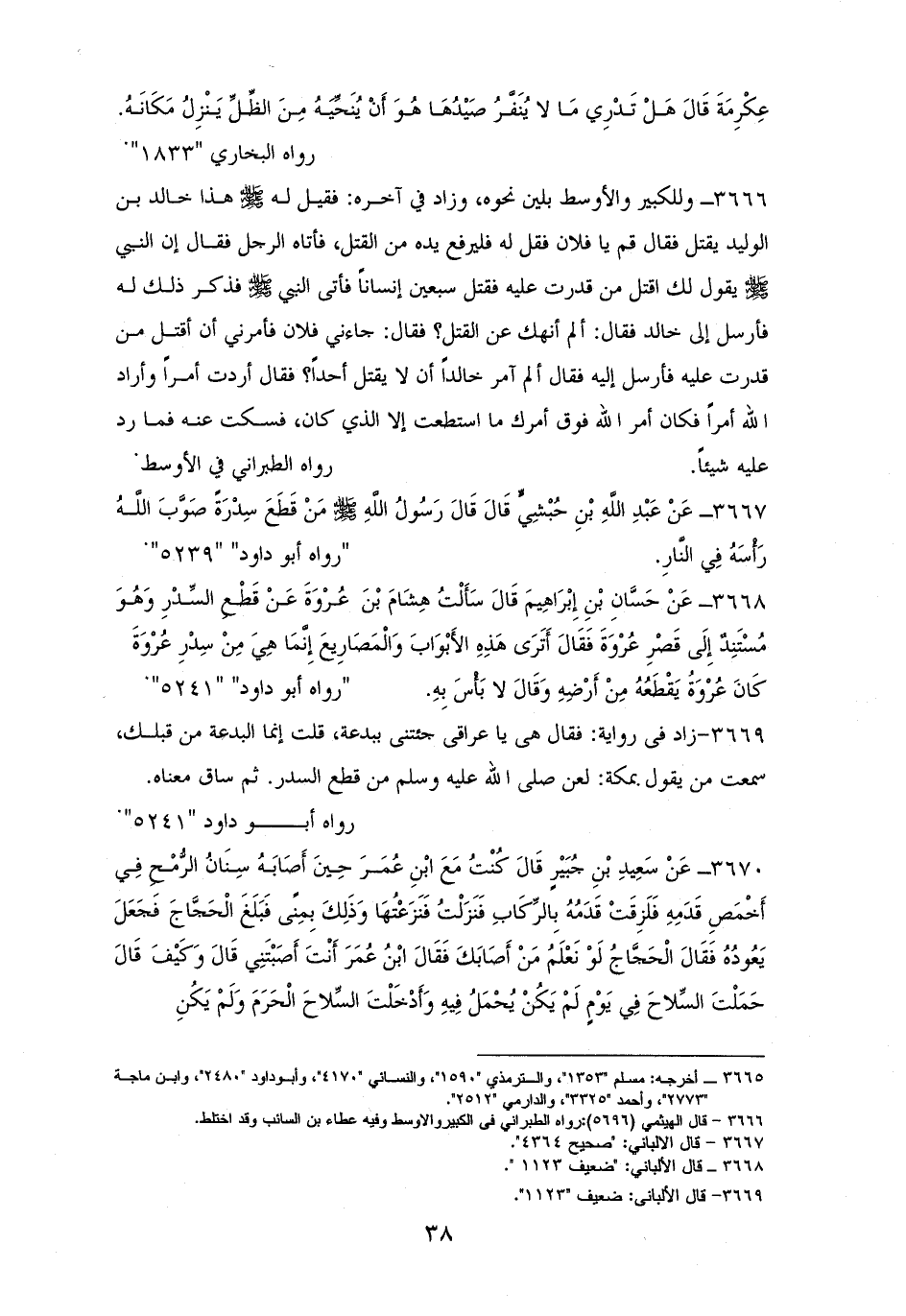 3667 - عَبْدُ الله بْنُ حُبْشِي: ((مَنْ قَطَعَ سِدْرَةً صَوَّبَ الله رَأْسَهُ فِي النَّارِ)). لأبي داود، وقال في حديث نحوه: يعني مَنْ قَطَعَ سِدْرَةً في فَلَاةٍ يَستَظِلُّ بها ابنَ السبيلِ والبهائم عبثًا، وقال في «الأوسط»: يعني من سدر الحرم. لأبي داود (¬1).