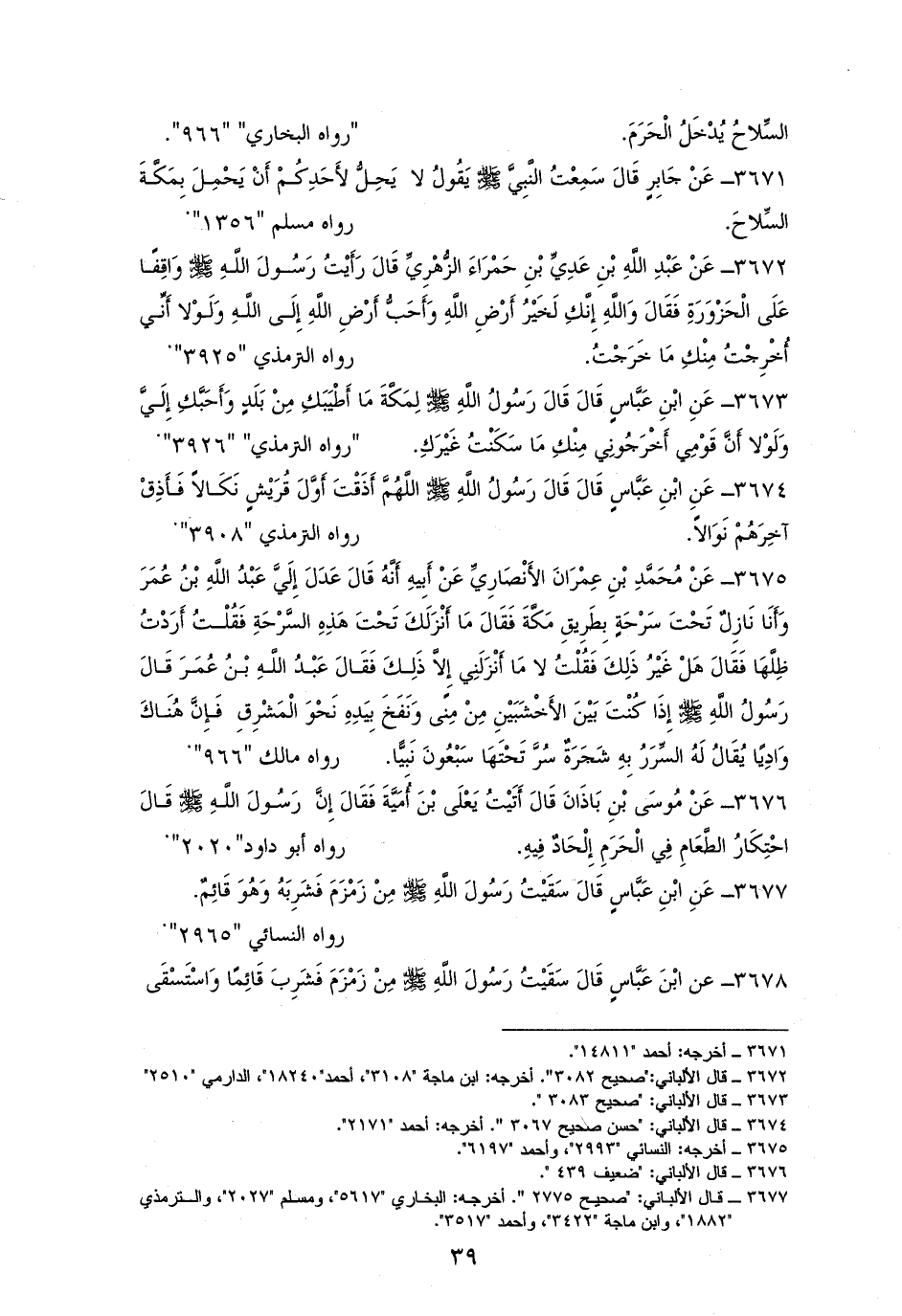 3671 - جَابِرٌ رفعه: ((لا يَحِلُّ أَنْ يُحْمِلَ السِّلاحَ بِمَكَّةَ)). لمسلم (¬1).