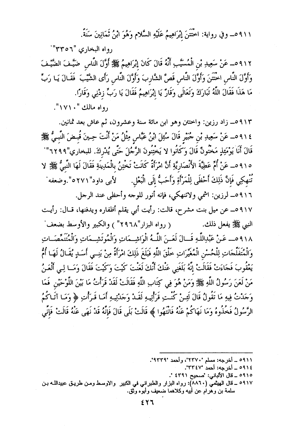5915 - أُمُّ عَطِيَّةَ أَنَّ امْرَأَةً كَانَتْ تَخْتِنُ النساء في المدينة فَقَالَ لَهَا النَّبِيُّ - صلى الله عليه وسلم -: ((لا تُنْهِكِي، فَإِنَّ ذَلِكَ أَحْظَى لِلْمَرْأَةِ وَأَحَبُّ للْبَعْلِ)). لأبي داود وضعفه (¬1).
