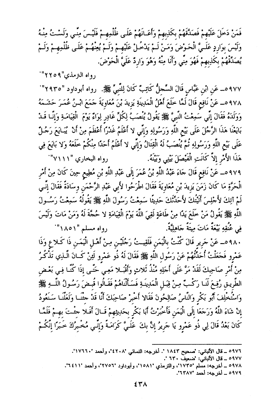 5979 - وعنه: لما خلعوا يزيد واجتمعوا على ابن مطيع أتاه ابن عمر، فقال ابن مطيع: اطْرَحُوا لأَبِي عَبْدِ الرَّحْمَنِ وِسَادَةً، فَقَالَ: لَمْ آتِكَ لأَجْلِسَ، أَتَيْتُكَ؛ لأَحَدِّثَكَ حَدِيثًا سمعته من النبي - صلى الله عليه وسلم - يَقُولُ: ((مَنْ خَلَعَ يَدًا مِنْ طَاعَةٍ لَقِيَ الله يَوْمَ الْقِيَامَةِ ولا حُجَّةَ لَهُ، وَمَنْ مَاتَ وَلَيْسَ فِي عُنُقِهِ بَيْعَةٌ مَاتَ مِيتَةً جَاهِلِيَّةً)). لمسلم (¬1).
