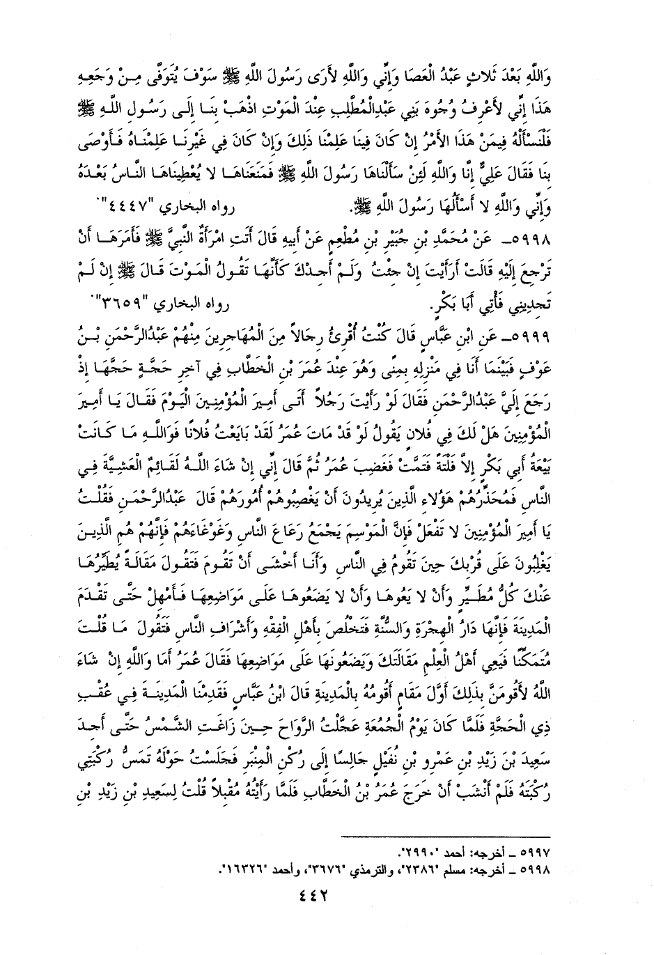-[443]- لَيَقُولَنَّ العشية على هذا المنبر مَقَالَةً لَمْ يَقُلْهَا مُنْذُ اسْتُخْلِفَ، فَأَنْكَرَ عَلَيَّ وَقَالَ: مَا عسى أَنْ يَقُولَ مَا لَمْ يَقُلْ قَبْلَهُ، فَجَلَسَ عُمَرُ عَلَى الْمِنْبَرِ فَلَمَّا سَكَتَ المؤذن قَامَ فَأَثْنَى عَلَى الله بِمَا هُوَ أَهْلُهُ ثُمَّ قَالَ: أَمَّا بَعْدُ فَإِنِّي قَائِلٌ لَكُمْ مَقَالَةً قَدْ قُدِّرَ أَنْ أَقُولَهَا لا أَدْرِي لَعَلَّهَا بَيْنَ يَدَيْ أَجَلِي فَمَنْ عَقَلَهَا وَوَعَاهَا فَلْيُحَدِّثْ بِهَا حَيْثُ انْتَهَتْ بِهِ رَاحِلَتُهُ، وَمَنْ خَشِيَ أَنْ لا يَعْقِلَهَا فَلا أُحِلُّ لأَحَدٍ أَنْ يَكْذِبَ عَلَيَّ، إِنَّ الله بَعَثَ مُحَمَّدًا - صلى الله عليه وسلم - بِالْحَقِّ وَأَنْزَلَ عَلَيْهِ الْكِتَابَ فَكَانَ مِمَّا أَنْزَلَ عليه آيَةُ الرَّجْمِ فَقَرَأْنَاهَا وَعَقَلْنَاهَا وَوَعَيْنَاهَا، رَجَمَ وَرَجَمْنَا بَعْدَهُ وأَخْشَى إِنْ طَالَ بِالنَّاسِ زَمَانٌ أَنْ يَقُولَ قَائِلٌ: وَالله مَا نَجِدُ آيَةَ الرَّجْمِ فِي كِتَابِ الله فَيَضِلُّوا بِتَرْكِ فَرِيضَةٍ أَنْزَلَهَا الله، فالرَّجْمُ فِي كِتَابِ الله حَقٌّ عَلَى مَنْ زَنَى إِذَا أُحْصِنَ مِنَ الرِّجَالِ وَالنِّسَاءِ إِذَا قَامَتِ الْبَيِّنَةُ، أَوْ كَانَ الْحَبَلُ أَوِ الإعْتِرَافُ، ثُمَّ إِنَّا كُنَّا نَقْرَأُ فِيمَا نَقْرَأُ مِنْ كِتَابِ الله: أَنْ لا تَرْغَبُوا عَنْ آبَائِكُمْ فَإِنَّهُ كُفْرٌ بِكُمْ أَنْ تَرْغَبُوا عَنْ آبَائِكُمْ، أَلا وإِنَّ رَسُولَ الله - صلى الله عليه وسلم - قَالَ: لا تُطْرُونِي كَمَا أُطْرِيَ عِيسَى ابْنُ مَرْيَمَ وَقُولُوا: عَبْدُ الله وَرَسُولُهُ ثُمَّ إِنَّهُ