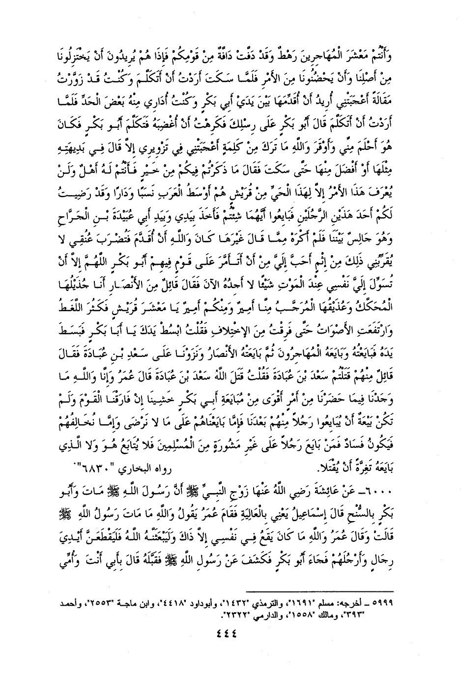 6000 - عَائِشَة: أَنَّ رَسُولَ الله - صلى الله عليه وسلم - مَاتَ وَأَبُو بَكْرٍ بِالسُّنْحِ فَقَامَ عُمَرُ يَقُولُ: وَالله مَا مَاتَ رَسُولُ الله - صلى الله عليه وسلم -: وَقَالَ مَا كَانَ يَقَعُ فِي نَفْسِي إِلاَّ ذَاكَ وَلَيَبْعَثَنَّهُ الله فَلَيَقْطَعَنَّ أَيْدِيَ رِجَالٍ وَأَرْجُلَهُمْ. فَجَاءَ أَبُو بَكْرٍ فَكَشَفَ عَنْ رَسُولِ الله - صلى الله عليه وسلم - فَقَبَّلَهُ وقَالَ: بِأَبِي أَنْتَ