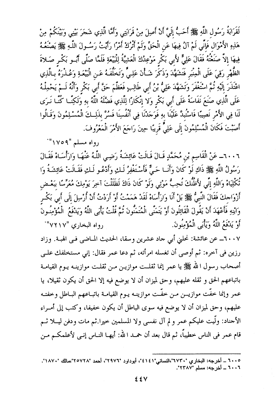 6007 - عائشةُ: نَحلني أَبي جاد عشرينَ وسقًا، الحديثُ الماضي فى الهبةِ. زادَ رزينُ في آخرِهِ: ثمَّ أَوصَى أَنْ تُغسِّلَهُ امرأتُهُ، ثمَّ دَعَا عمرُ فقالَ: إني مستخلفُكَ على أصحابِ رسولِ الله - صلى الله عليه وسلم -: يا عمرُ، إنما ثقُلتْ (موازين) (2) من ثقُلَتْ موازينُهُ يومَ القيامةِ باتباعِهِمُ الحقَ وثُقلُهُ عليهِم، وحُقَّ لميزانٍ لا يوضعُ فيه إلا الحقُ أنْ يكونَ ثقيلاً، يا عمرُ، وإنمَا خفّت موازينُ من خَفّتْ موازينُهُ يومَ القيامِة باتباعهِمُ البَاطِلَ وخِفَّتهُ عليهمْ، وحقَّ لميزانٍ لا يوضعُ فيهِ سوىَ الباطلِ أنْ يكونَ خفيفاً، وكتبَ إلى أمراءِ الأجنادِ: ولّيت عليكم عمر، ولم آل نفسى ولا المسلمين خيراً. ثمَّ ماتَ ودفنَ ليلاً ثمَّ قامَ عمُر في الناسِ خطيباً، ثمَّ قالَ بعدَ أنْ حمدَ الله: أيُّها الناسُ إني لأعلمكُم مِنْ