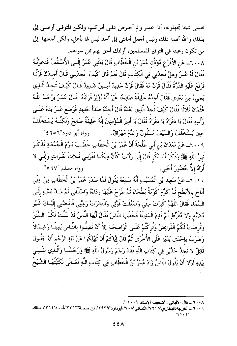 6009 - لمسلم عن معدان بن أبي طلحة، وللبخاري عن جرير بن قدامة مختصر. قلت: طلبته في أبي داود ومسلم فلم أجده: عمر خَطَبَ يَوْمَ الْجُمُعَةِ فَذَكَرَ النَبِيَّ - صلى الله عليه وسلم - وأَبَا بَكْرٍ ثم قَالَ: إِنِّي رَأَيْتُ كَأَنَّ دِيكًا نَقَرَنِي ثَلاثَ نَقَرَاتٍ وَإِنِّي لا أُرَاهُ إِلاَّ حُضُورَ أَجَلِي. للشيخين مطولاً (¬1).