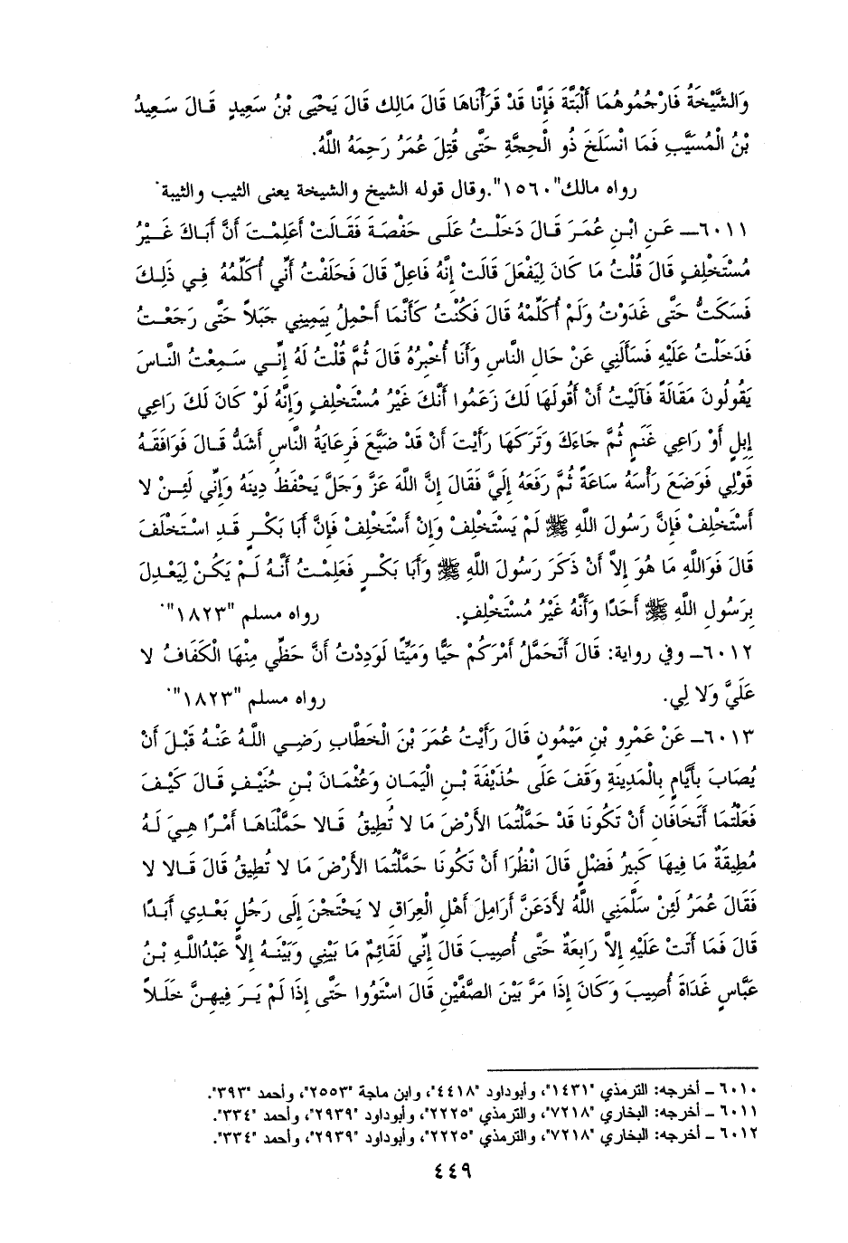 6011 - ابْن عُمَرَ: دَخَلْتُ عَلَى حَفْصَةَ ونوساتها تنظف، فَقَالَتْ: أَعَلِمْتَ أَنَّ أَبَاكَ غَيْرُ مُسْتَخْلِفٍ؟ قُلْتُ: مَا كَانَ لِيَفْعَلَ. قَالَتْ: إِنَّهُ فَاعِلٌ فَحَلَفْتُ أَنِّي أُكَلِّمُهُ فِي ذَلِكَ فَسَكَتُّ حَتَّى غَدَوْتُ وَلَمْ أُكَلِّمْهُ فَكُنْتُ كَأَنَّمَا أَحْمِلُ بِيَمِينِي جَبَلاً حَتَّى رَجَعْتُ فَدَخَلْتُ عَلَيْهِ، فَسَأَلَنِي عَنْ حَالِ النَّاسِ وَأَنَا أُخْبِرُهُ ثُمَّ قُلْتُ لَهُ: إِنِّي سَمِعْتُ النَّاسَ يَقُولُونَ مَقَالَةً فَآلَيْتُ أَنْ أَقُولَهَا لَكَ، زَعَمُوا أَنَّكَ غَيْرُ مُسْتَخْلِفٍ، وَإِنَّهُ لَوْ كَانَ رَاعِي إِبِلٍ أَوْ غَنَمٍ ثُمَّ جَاءَكَ وَتَرَكَهَا لرَأَيْتَ أَنْ قَدْ ضَيَّعَ، فَرِعَايَةُ النَّاسِ أَشَدُّ، فَوَافَقَهُ قَوْلِي فَوَضَعَ رَأْسَهُ سَاعَةً ثُمَّ رَفَعَهُ إِلَيَّ فَقَالَ: إِنَّ الله يَحْفَظُ دِينَهُ، وَإِنِّي إن لا أَسْتَخْلِفْ فَإِنَّ رَسُولَ الله - صلى الله عليه وسلم - لَمْ يَسْتَخْلِفْ، وَإِنْ أَسْتَخْلِفْ فَإِنَّ أَبَا بَكْرٍ قَدِ اسْتَخْلَفَ، فَوَالله مَا هُوَ إِلاَّ أَنْ ذَكَرَ رَسُولَ الله - صلى الله عليه وسلم - وَأَبَا بَكْرٍ فَعَلِمْتُ أَنَّهُ لَمْ يَكُنْ لِيَعْدِلَ بِرَسُولِ الله - صلى الله عليه وسلم - أَحَدًا وَأَنَّهُ غَيْرُ مُسْتَخْلِفٍ (¬1).