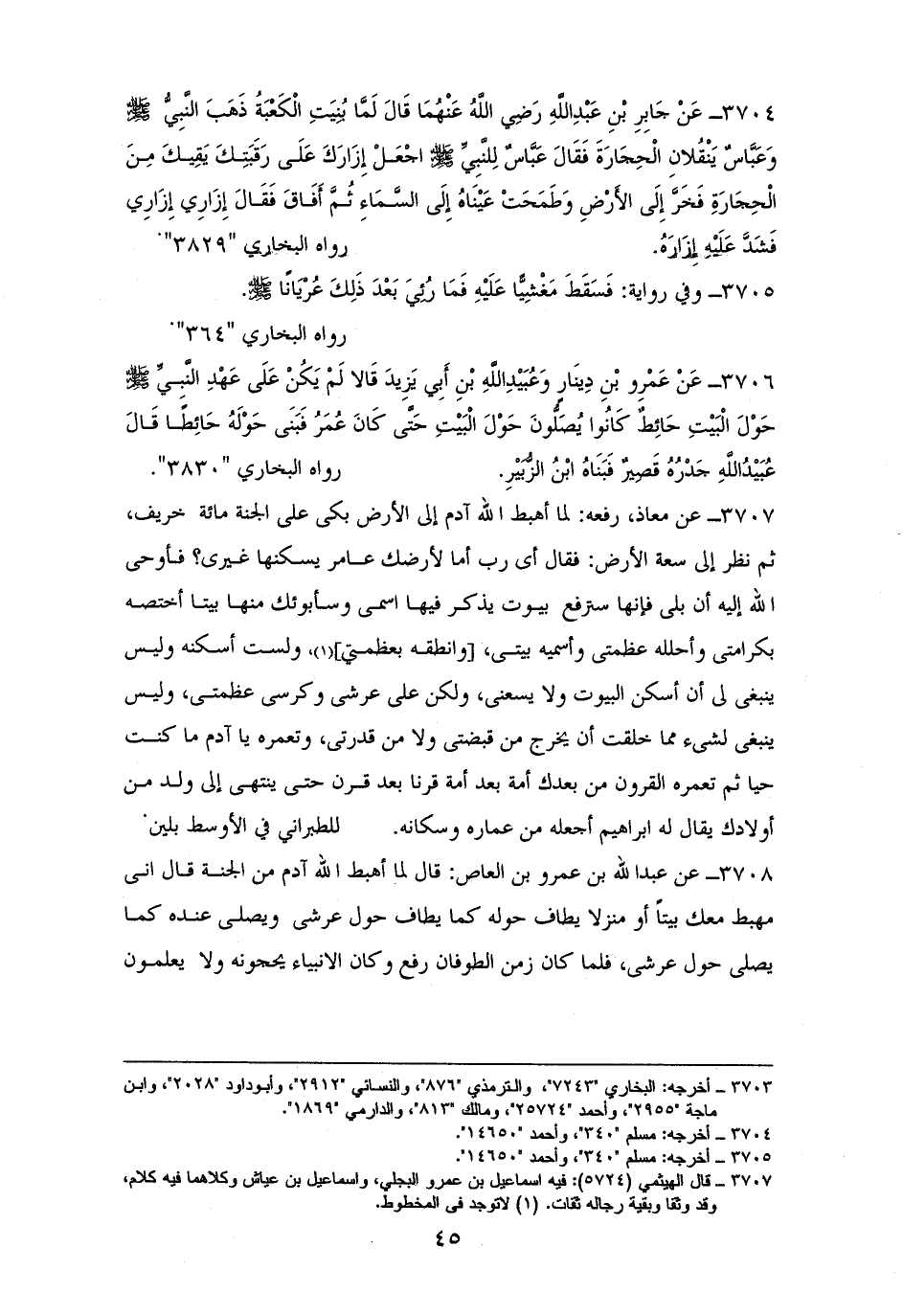 3708 - ابنُ عمرِو بن العاص قال: لما أهبط الله آدم من الجنة، قال: إنى مهبط معك بيتاً أو منزلا يطاف حوله كما يطاف حول عرشي ويصلى عنده كما يصلى حول عرشي، فلما كان زمن الطوفان رفع، وكان الأنبياء يحجونه ولا يعلمون
