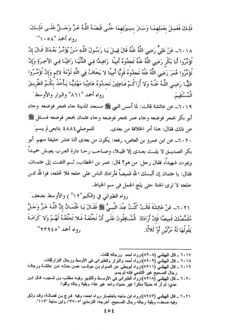6018 - عَلِيُّ قِيلَ: يَا رَسُولَ الله مَنْ نؤمر بَعْدَكَ؟ قَالَ: ((إِنْ تُؤَمِّرُوا أَبَا بَكْرٍ تَجِدُوهُ أَمِينًا زَاهِدًا فِي الدُّنْيَا رَاغِبًا فِي الآخِرَةِ، وَإِنْ تُؤَمِّرُوا عُمَرَ تَجِدُوهُ قَوِيّاً أَمِيناً لا تأخذه فِي الله لَوْمَةُ لائِمٍ، وَإِنْ تُؤَمِّرُوا عَلِيًّا وَلا أُرَاكُمْ فَاعِلِينَ تَجِدُوهُ هَادِيًا مَهْدِيًّا يَأْخُذُ بِكُمُ الطَّرِيقَ الْمُسْتَقِيمَ)). لأحمد والبزار والأوسط (¬1).