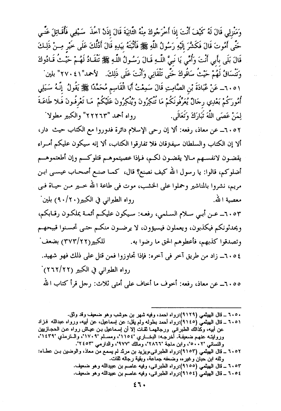 6051 - عُبَادَة رفعه: ((إِنَّهُ سَيَلِي أُمُورَكُمْ بَعْدِي رِجَالٌ يُعَرِّفُونَكُمْ مَا تُنْكِرُونَ وَيُنْكِرُونَ عَلَيْكُمْ مَا تَعْرِفُونَ فَلا طَاعَةَ لِمَنْ عَصَى الله َتَعَالَى)). لأحمد والكبير مطولاً (¬1).