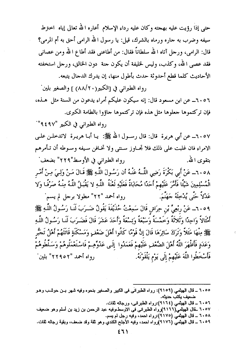 6057 - أبو هريرة رفعه: ((لاتدخلن على الامراء فإن غلبت على ذلك فلا تجاوز سنتى ولا تخافن سيفه وسوطه أن تأمر بتقوى الله)). للأوسط بضعف (¬1).