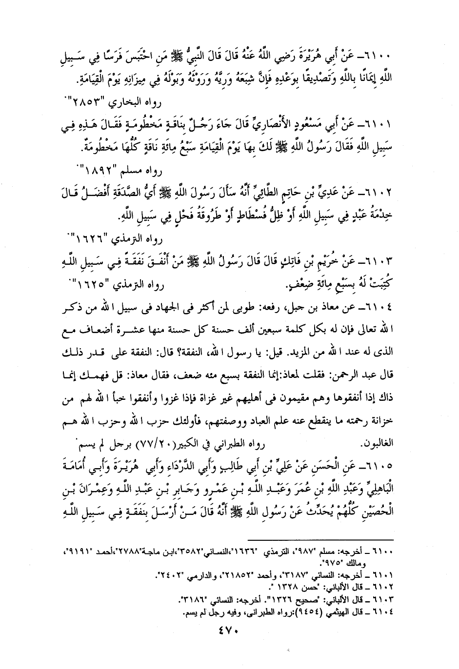 6101 - أبو سعيد: جاء رجلٌ بناقةٍ مخطومةٍ إلى النبي - صلى الله عليه وسلم - فقال: هذه في سبيل الله. قال - صلى الله عليه وسلم - ((لله بها يوم القيامة سبعمائة ناقةٍ، كلها مخطومة)) لمسلم، والنسائي (¬1).