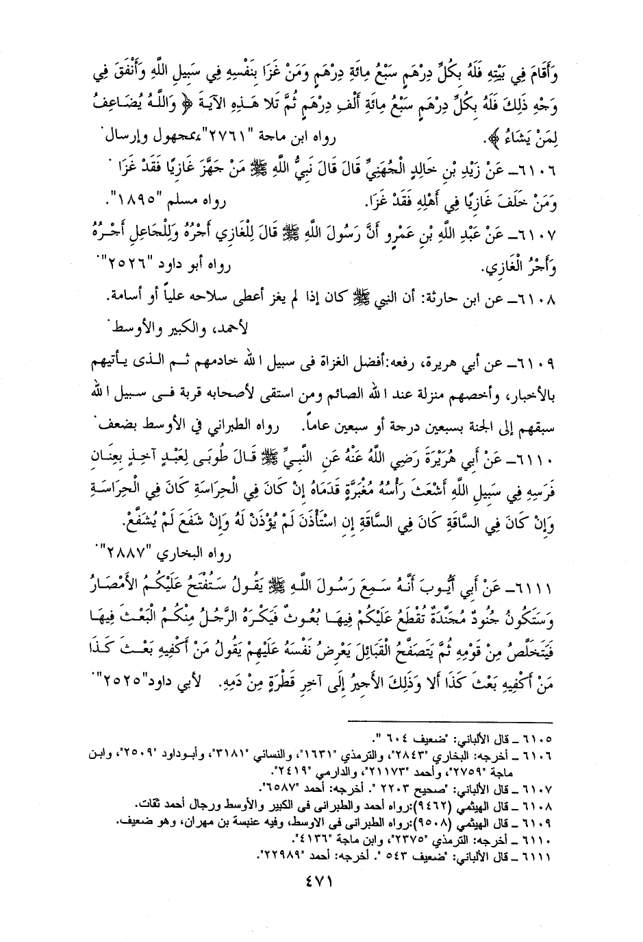 6106 - زيد بن خالد رفعه: ((من جهز غازيًا في سبيل الله فقد غزا، ومن خلف غازيًا في أهله بخيرٍ فقد غزا)) للستة إلا مالكًا (¬1).