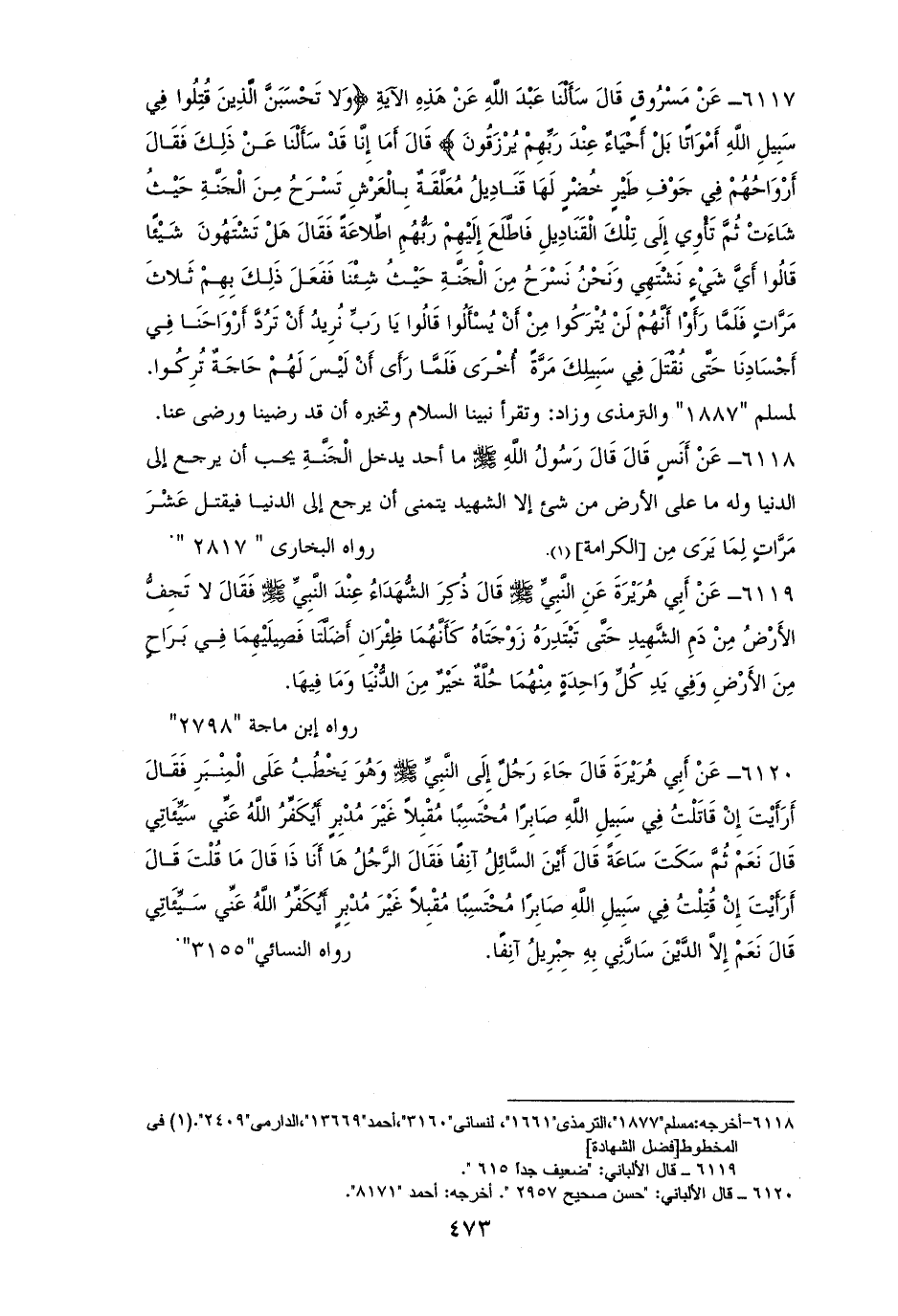 6117 - مسروق: سألنا عبد الله عن هذه الآية {وَلا تَحْسَبَنَّ الَّذِينَ قُتِلُوا فِي سَبِيلِ الله أَمْوَاتاً} [آل عمران: 169] فقال: إنا سألنا عن ذلك رسول الله - صلى الله عليه وسلم - فقال: ((أرواحهم في جوف طيرٍ خضرٍ، لها قناديل معلقة بالعرش، تسرح من الجنة حيث شاءت ثم تأوي إلى تلك القناديل، فاطلع إليهم ربهم اطلاعة، فقال: هل تشتهون شيئًا؟ قالوا: أي شيء نشتهي ونحن نسرح من الجنة حيث شئنا؟ ففعل، ذلك بهم ثلاث مرات، فلما رأوا أنهم لن يتركوا من أن يسألوا قالوا: يا رب نريد، أن ترد أرواحنا في أجسادنا حتى نقتل في سبيلك مرةً أخرى، فلما رأى أن ليس لهم حاجة تركوا)). لمسلم والترمذي وزاد: وتقرأ نبيًا السلام وتخبره أن قد رضينا ورضي عنا (¬1).