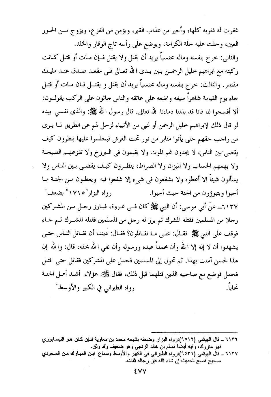 6137 - أبو موسى: أنَّ النبي - صلى الله عليه وسلم - كان في غزاةٍ فبارز رجلٌ من المشركين رجلاً من المسلمين، فقتله المشرك ثم برز له رجلٌ من المسلمين، فقتله المشرك، ثم جاء فوقف على النبي - صلى الله عليه وسلم - فقال: علام تقاتلون؟ فقال: ديننا أن نقاتل الناس حتى يشهدوا أن لا إله إلا الله وأن محمدًا عبده ورسوله وأن نفي الله بحقه، قال: والله إن هذا لحسن آمنت بهذا ثم تحول إلى المسلمين فحمل على المشركين فقائل حتى قتل، فحمل فوضع مع صاحبيه الذين قتلهما قبل ذلك، فقال - صلى الله عليه وسلم -: ((هؤلاء أشد أهل الجنة تحابا)) ((للكبير)) و ((الأوسط)) (¬1).