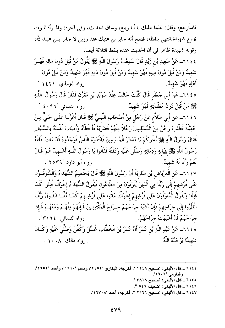 6144 - سعيد بن زيد رفعه: ((من قتل دون مالهٍ فهو شهيده، ومن قتل دون دمه فهو شهد، ومن قتل دون دينه فهو شهيد، ومن قتل دون أهله فهو شهيد)). لأصحاب السنن (¬1).