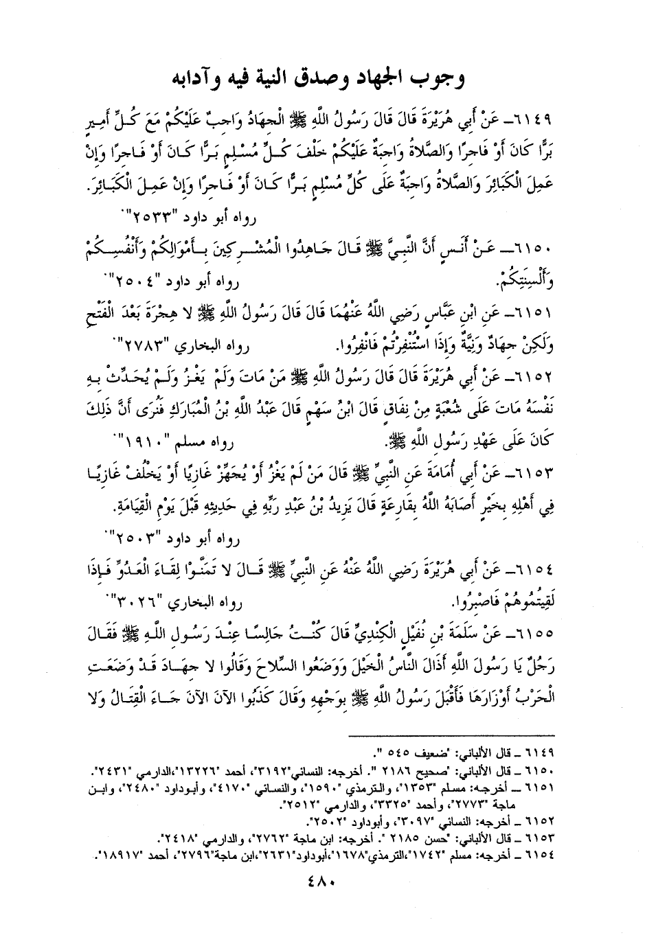 6149 - أبو هريرة رفعه: ((الجهاد واجبٌ عليكم مع كل أميرٍ برًا كان أو فاجرًا، والصلاة واجبةٌ عليكم خلف كل مسلمٍ برًا كان أو فاجرًا، وإن عمل الكبائر والصلاة واجبة على كل مسلم برًا كان أو فاجرًا، وإن عمل الكبائر)) لأبي داود (¬1).
