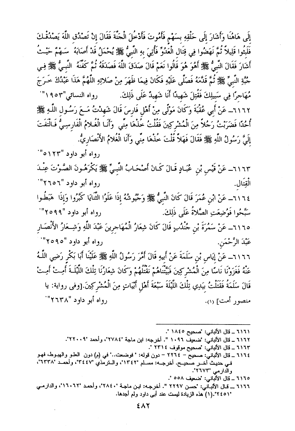 6166 - سلمة بن الأكوع: أمر علينا النبي - صلى الله عليه وسلم - مرة أبا بكر في غزاةٍ فبيتنا أناسًا من المشركين نقتلهم، وقتلت أنا بيدي تلك الليلة سبعة أهل أبياتٍ، وكان شعارنا: أمت أمت. وفي روايةٍ: يا منصور أمت (¬1).