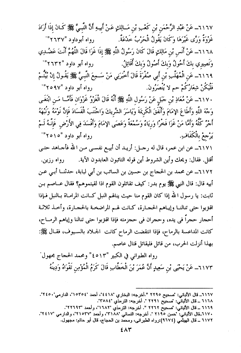 6167 - كعب بن مالك: كان النبي - صلى الله عليه وسلم - إذا غزا ناحيةً ورى بغيرها وكان يقول: ((الحرب خدعة)). هي لأبي داود (¬1).