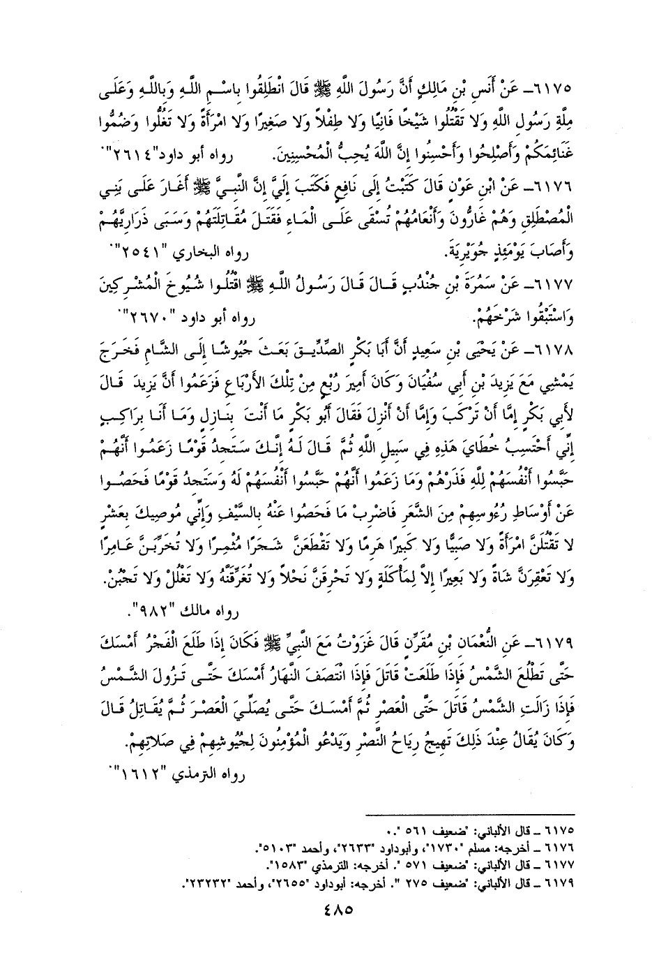 6175 - أنس أن النبي - صلى الله عليه وسلم - كان إذا بعث جيشًا قال: ((انطلقوا بسم الله، ولا تقتلوا شيخًا فانيًا ولا طفلاً صغيرًا ولا امرأة ولا تغلوا وضموا غنائمكم وأصلحوا وأحسنوا إن الله يحب المحسنين)). لأبي داود (¬1).